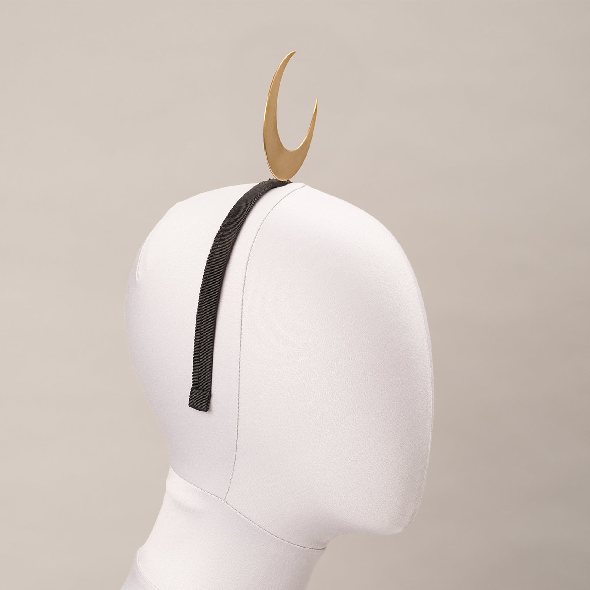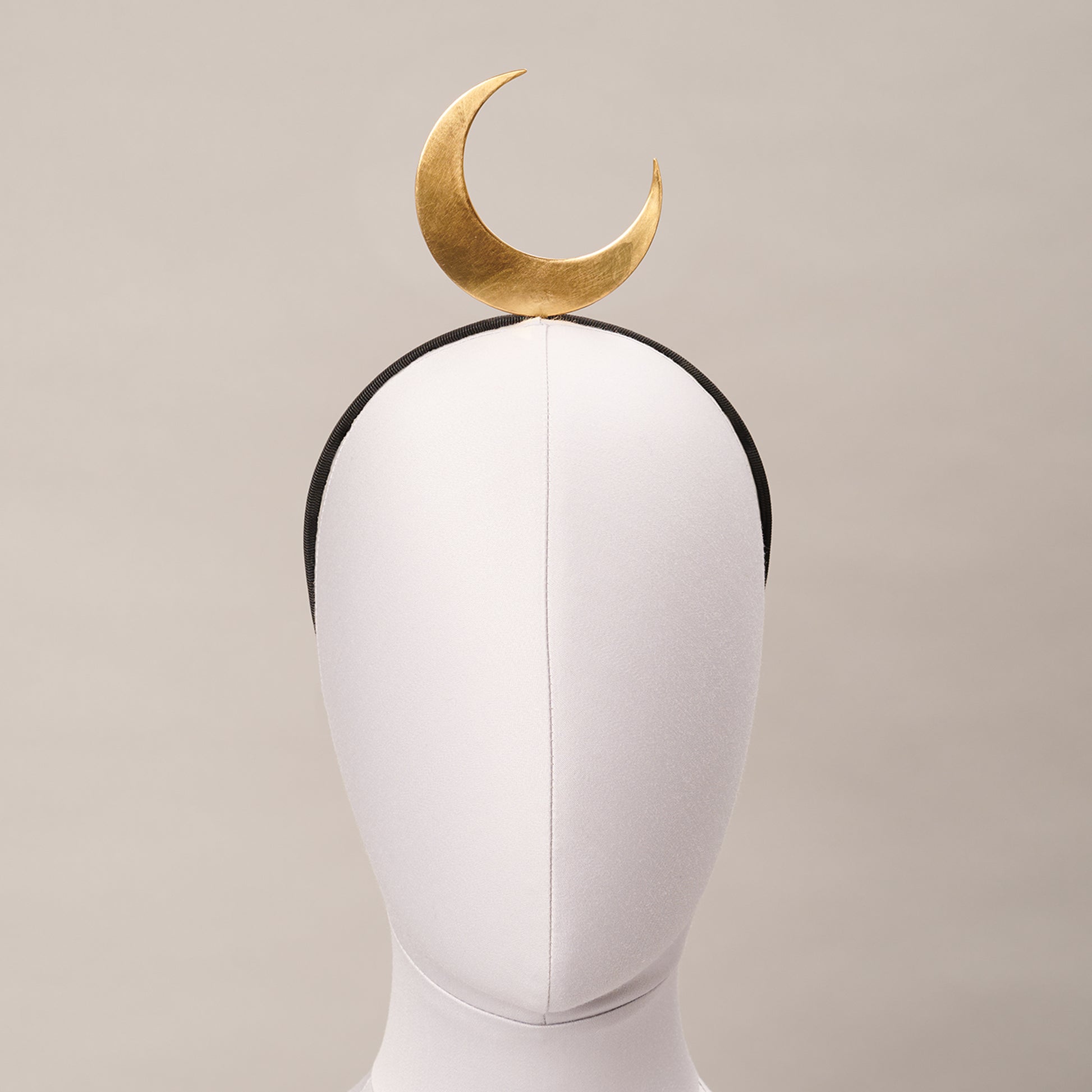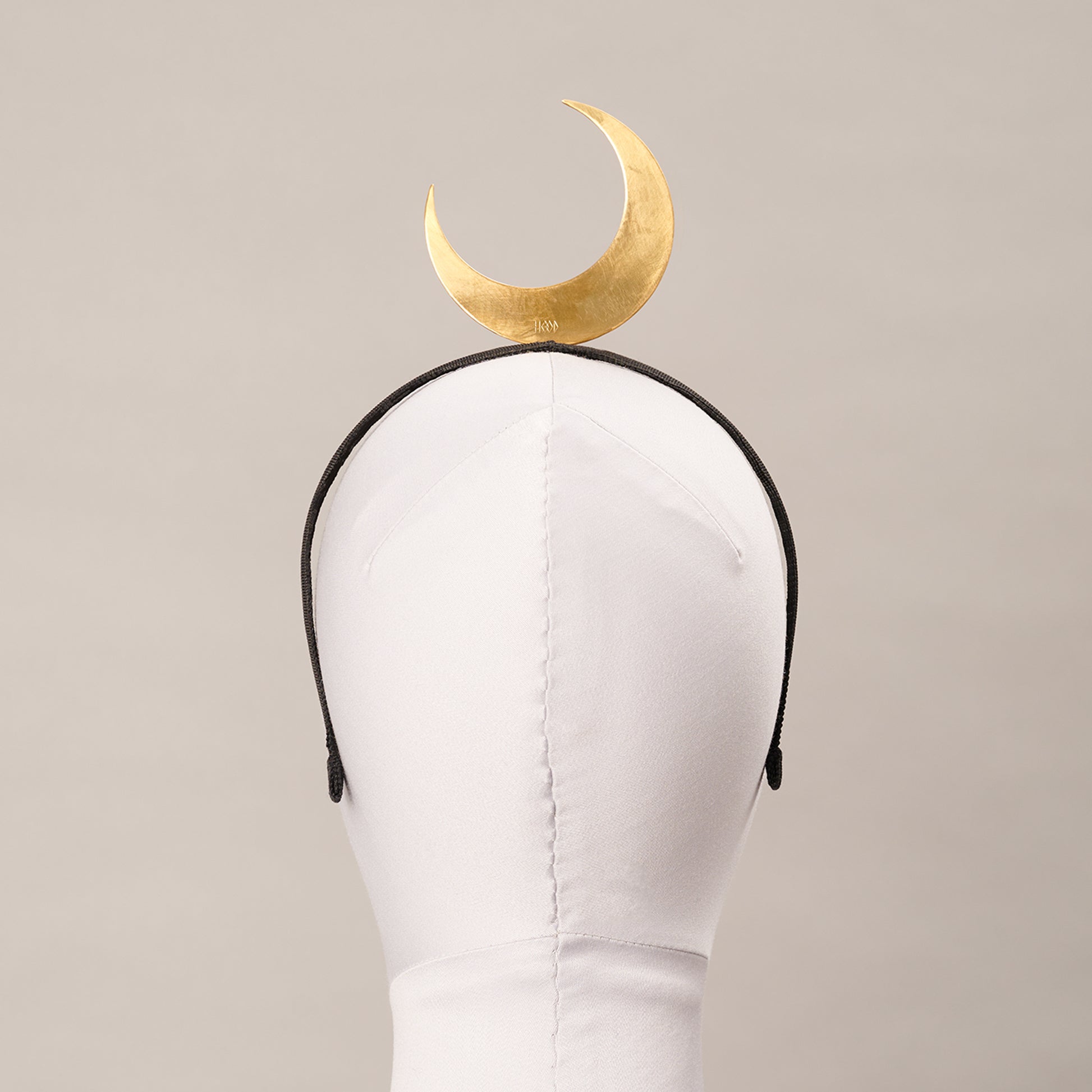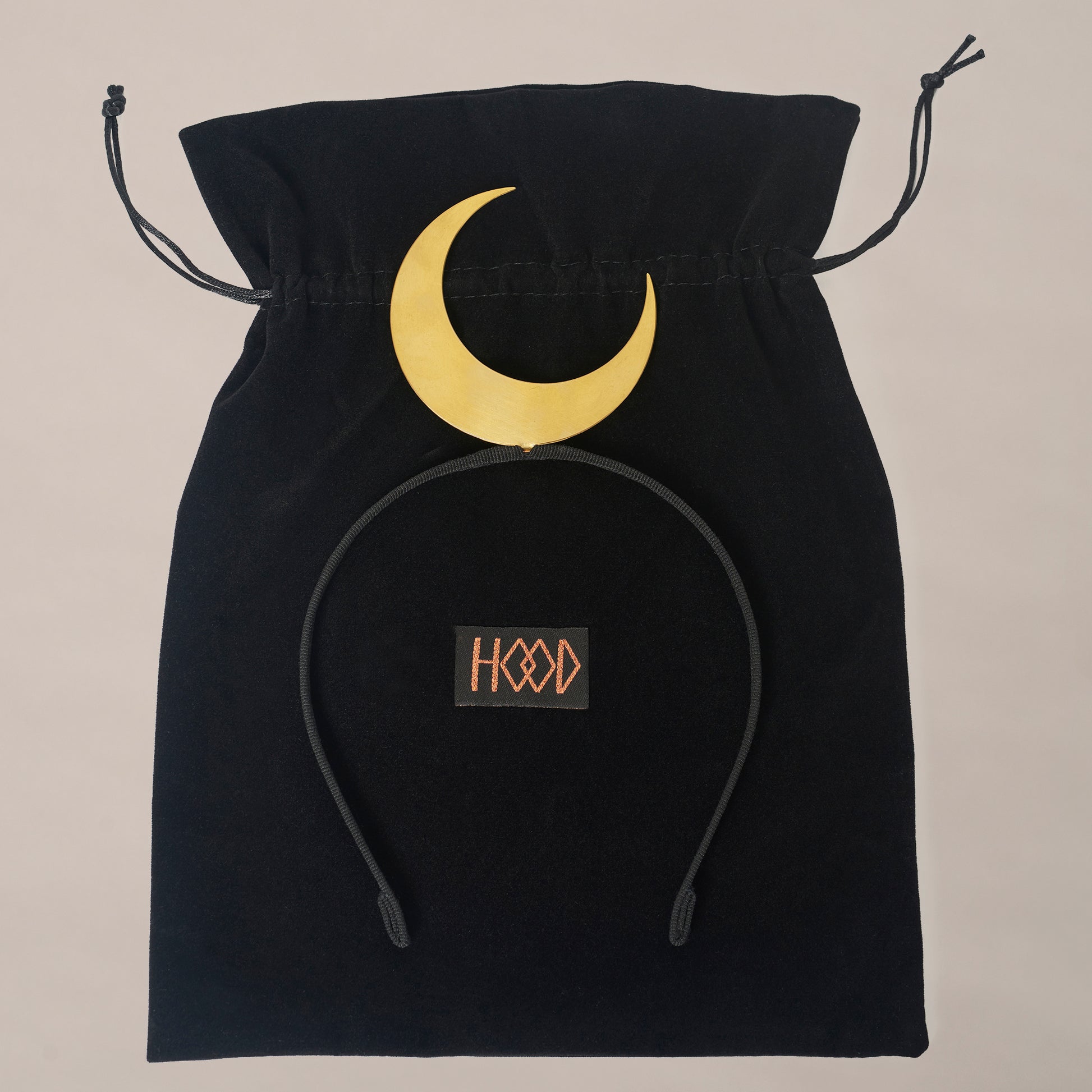 Embrace your inner goddess with HOOD’s iconic acid etched brass moon. The brass has been hand sanded and rubbed to a soft finish. Mounted on a black* Petersham covered headband.