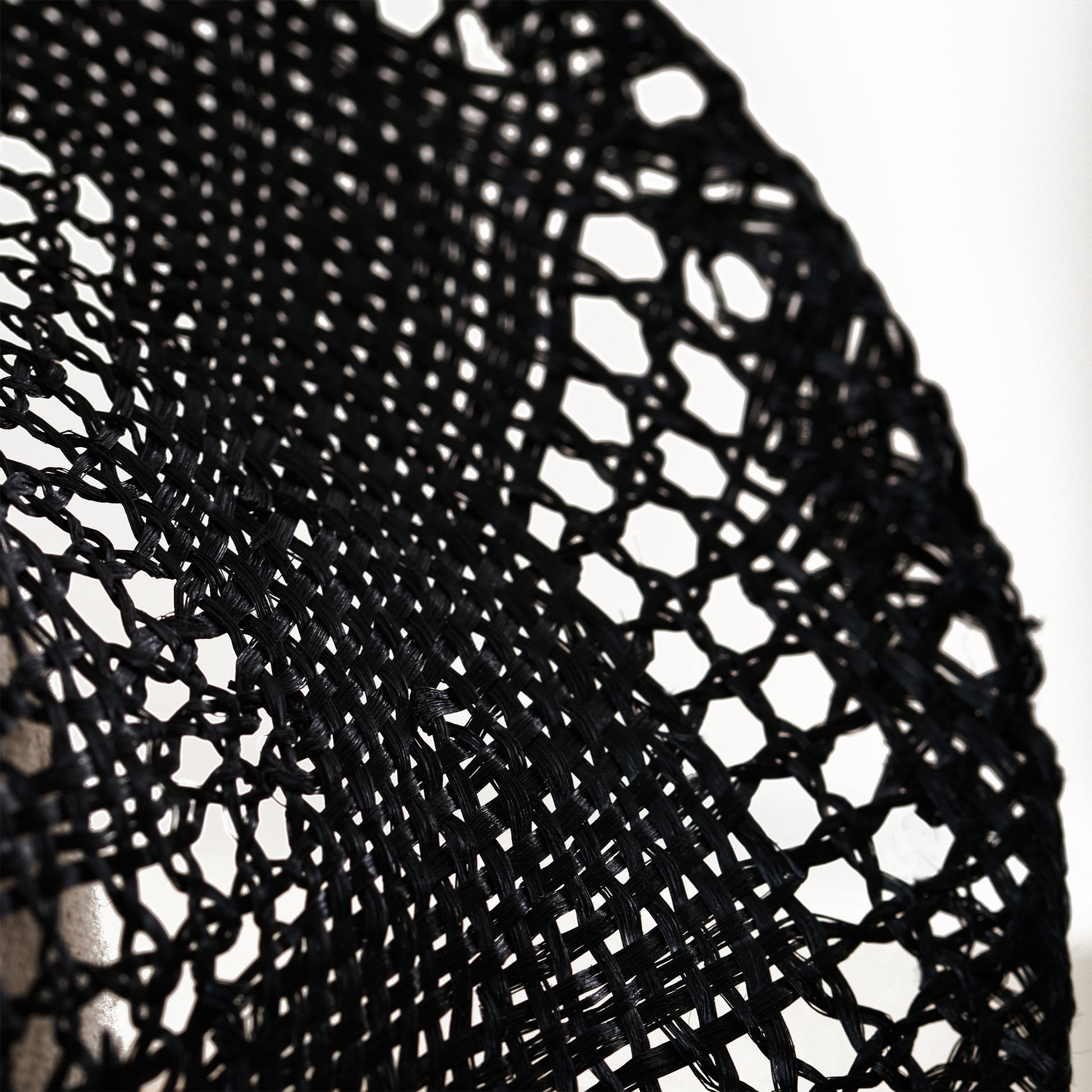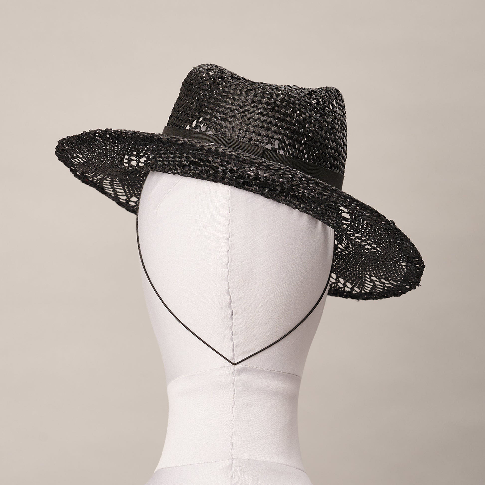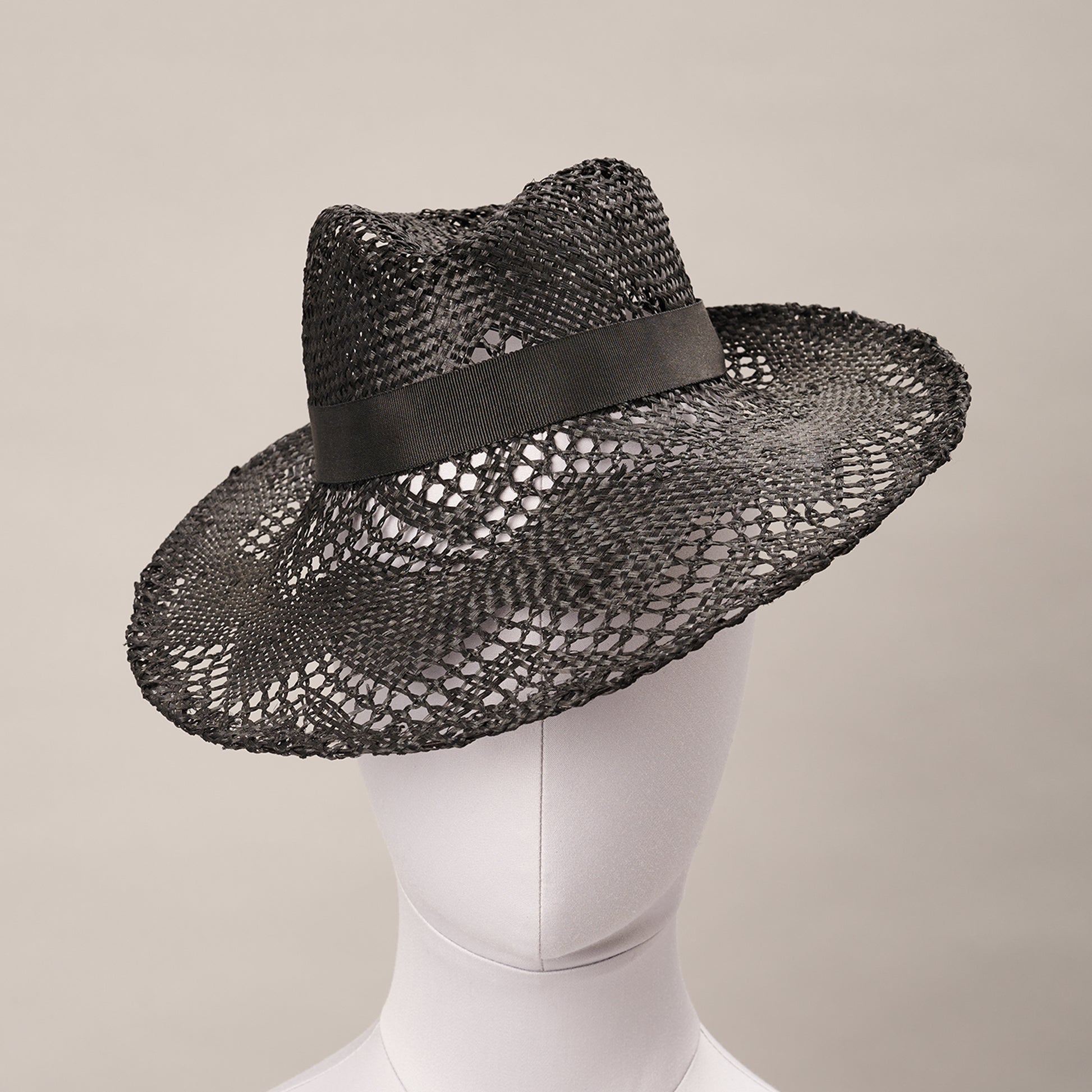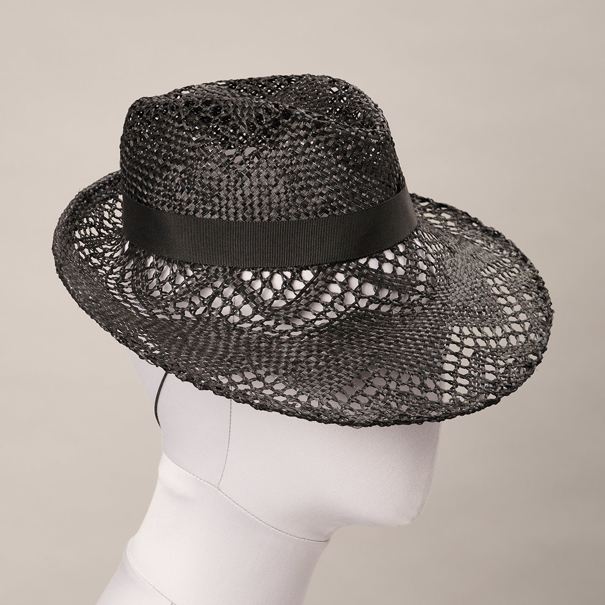 A feminine black lace straw vintage-style ‘percher’ blocked with a dipped crown. The turned wire edge emphasises its distinctive shape while the intricately woven straw casts a beguiling shadow.