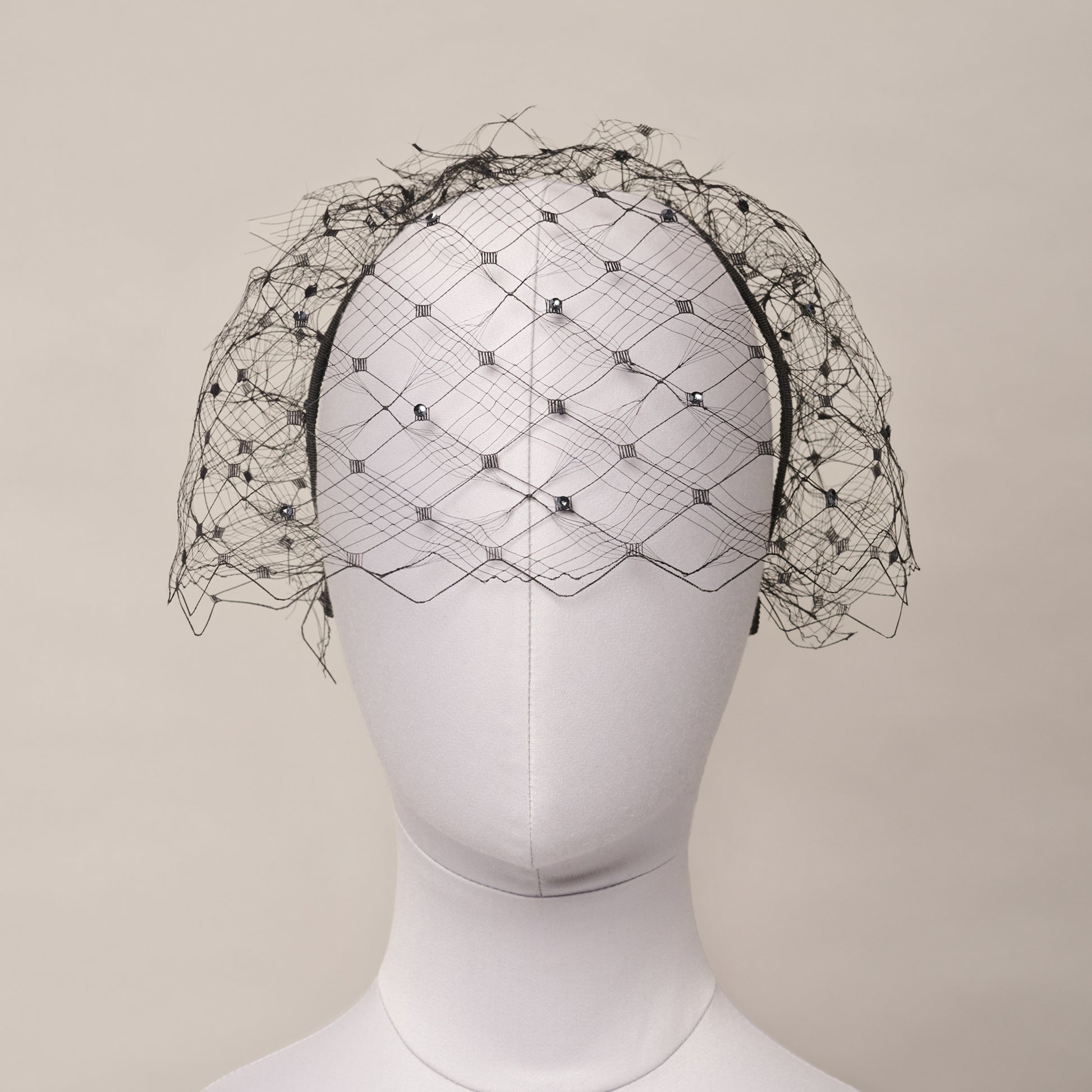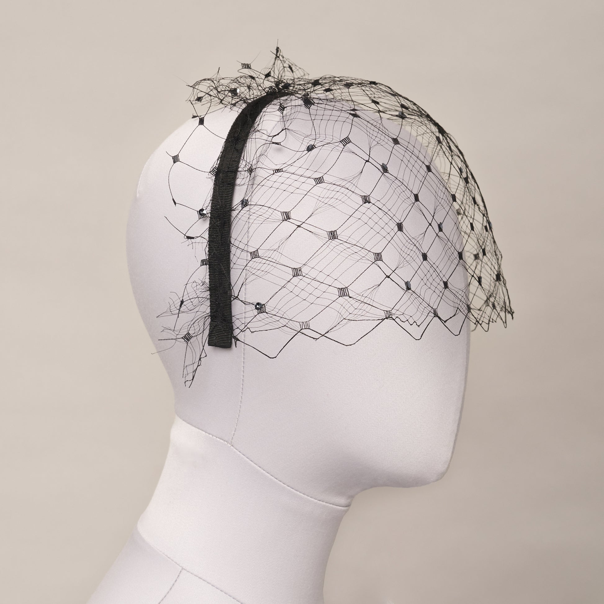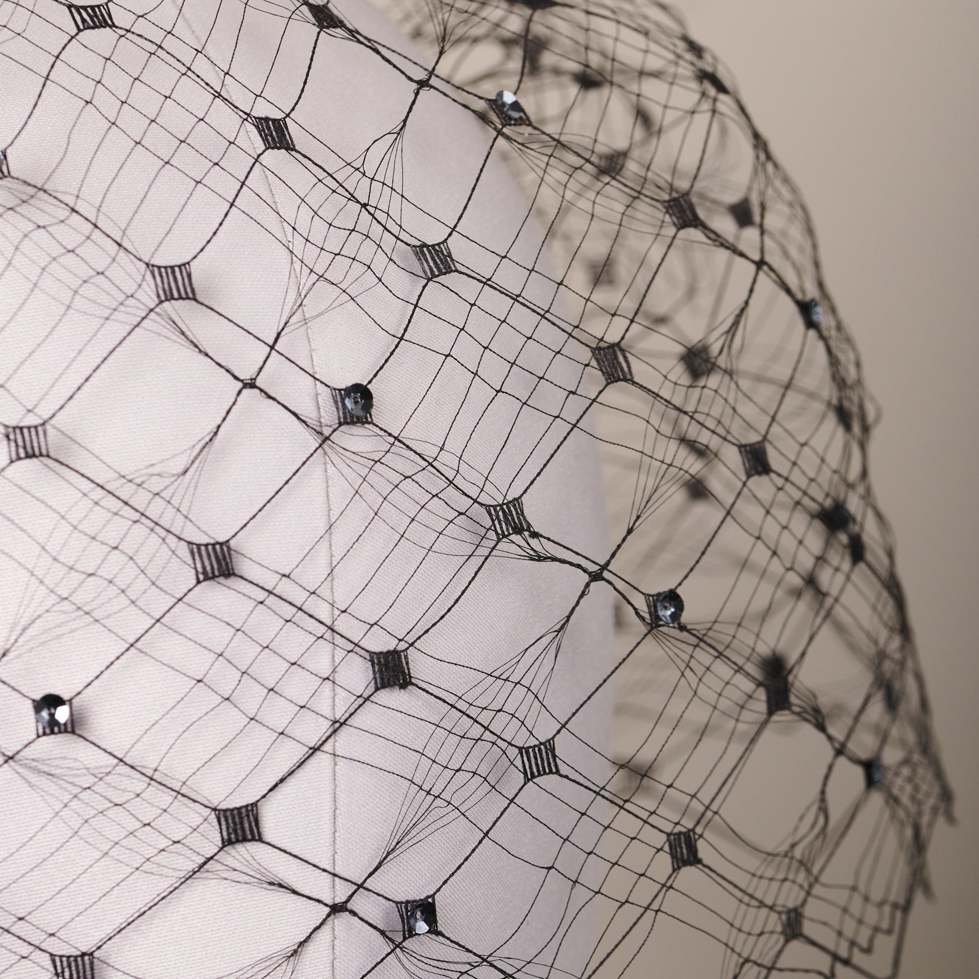 A double-layered half-face veil that combines structure with whimsy. The sculptural base layer creates a defined silhouette, while the delicate top layer of 1950s vintage veiling adds romantic enchantment. Finished with small deadstock sequins that catch the light for added allure.