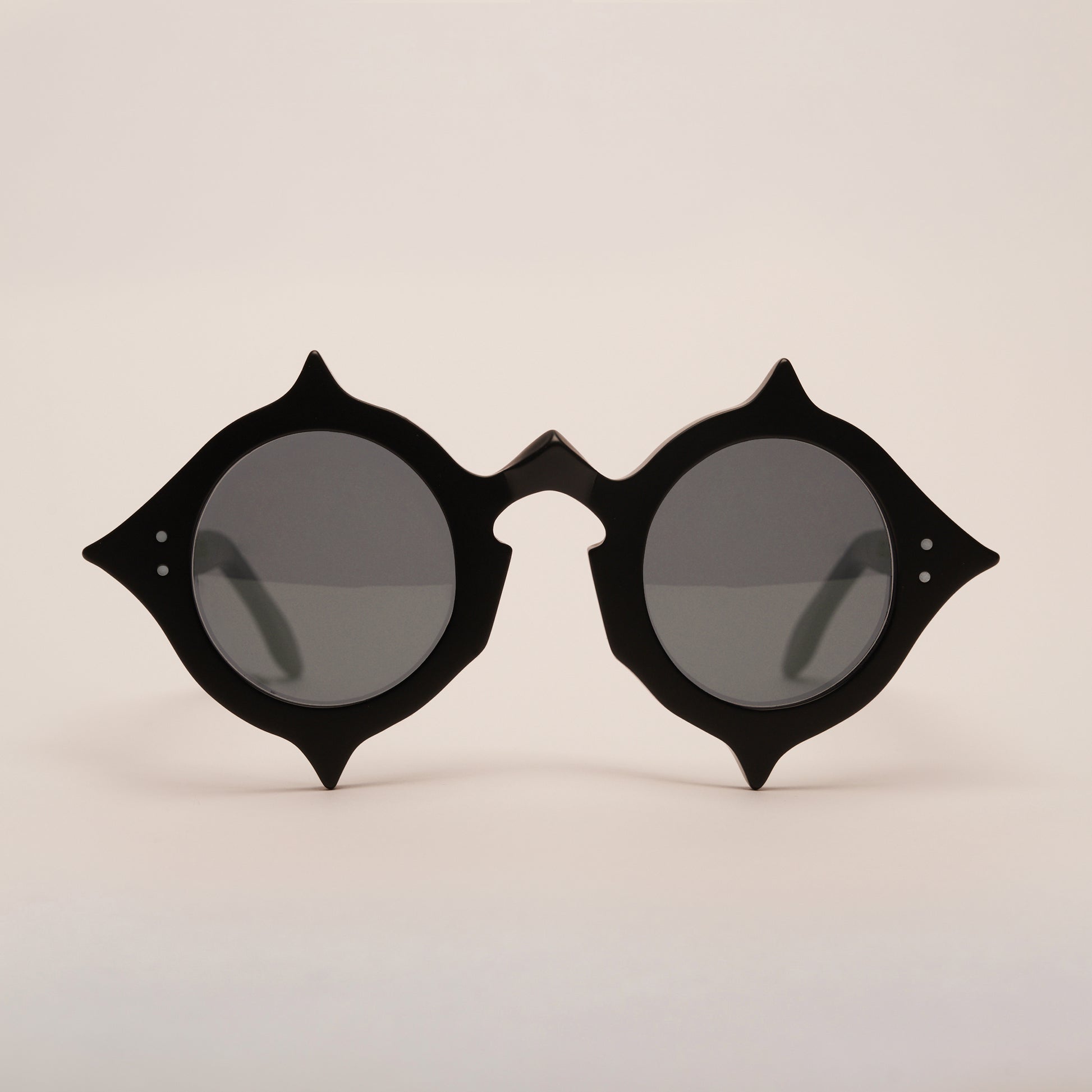 Created for the audacious, these sunglasses are inspired by the subversive glamour of Marisa Mell in Danger: Diabolik. The sculptural cat-eye silhouette curves subtly toward the face, contrasted by sharp, spike accents. Made in matte black acetate and fitted with grey lenses, these sunglasses are designed not just to complement, but to provoke – for those who dress to disrupt.