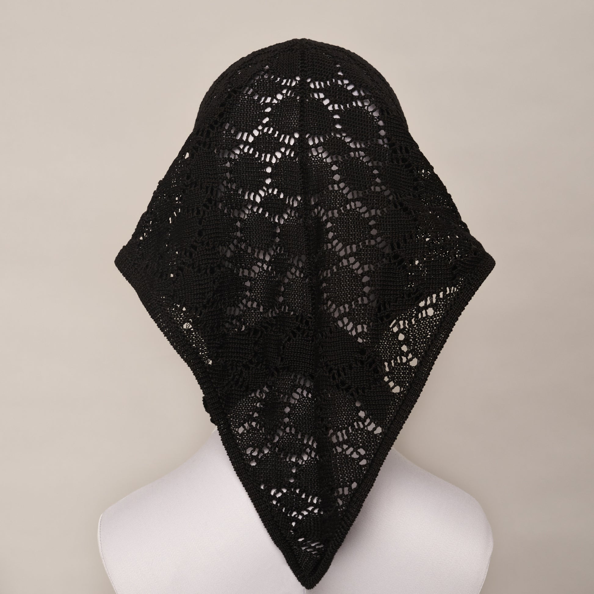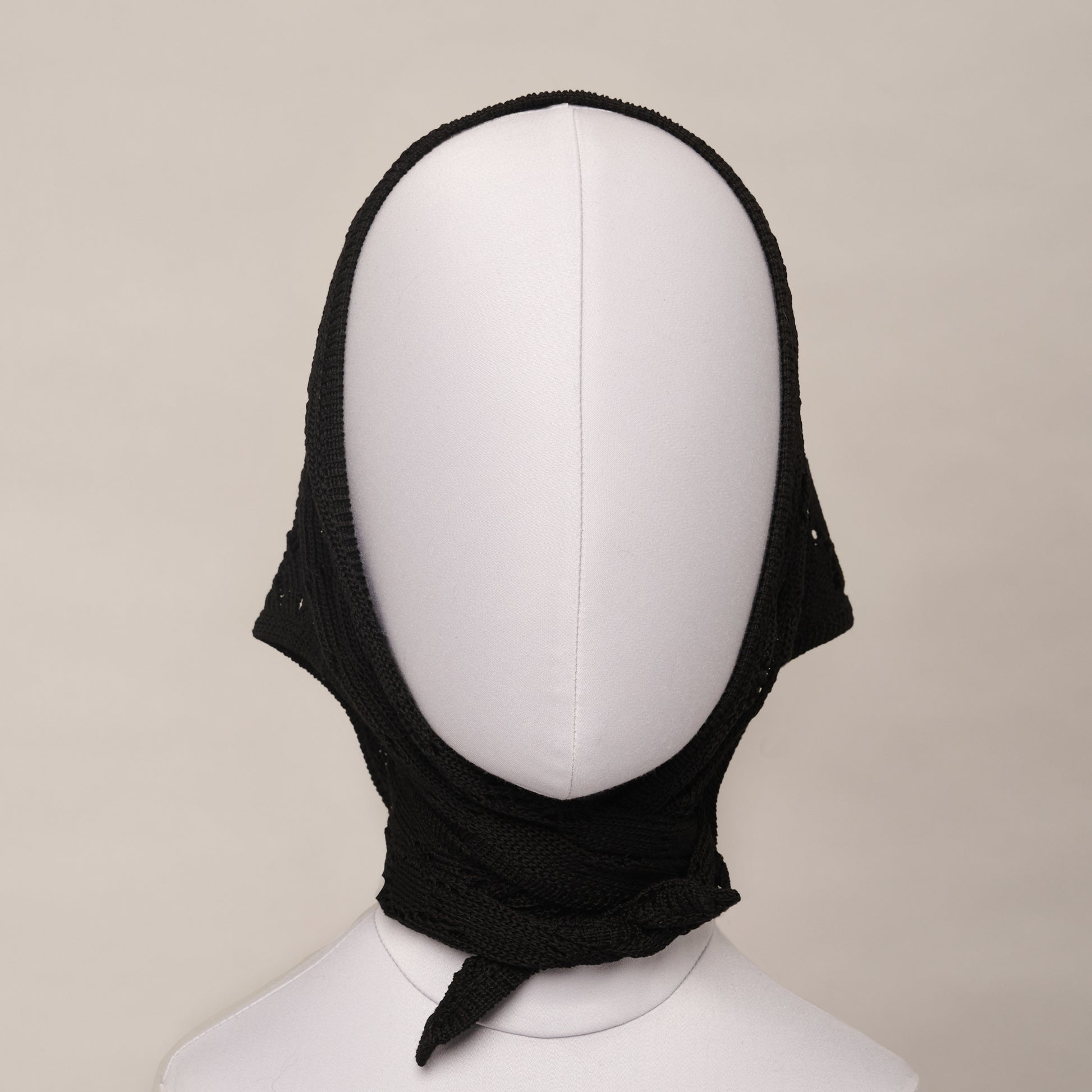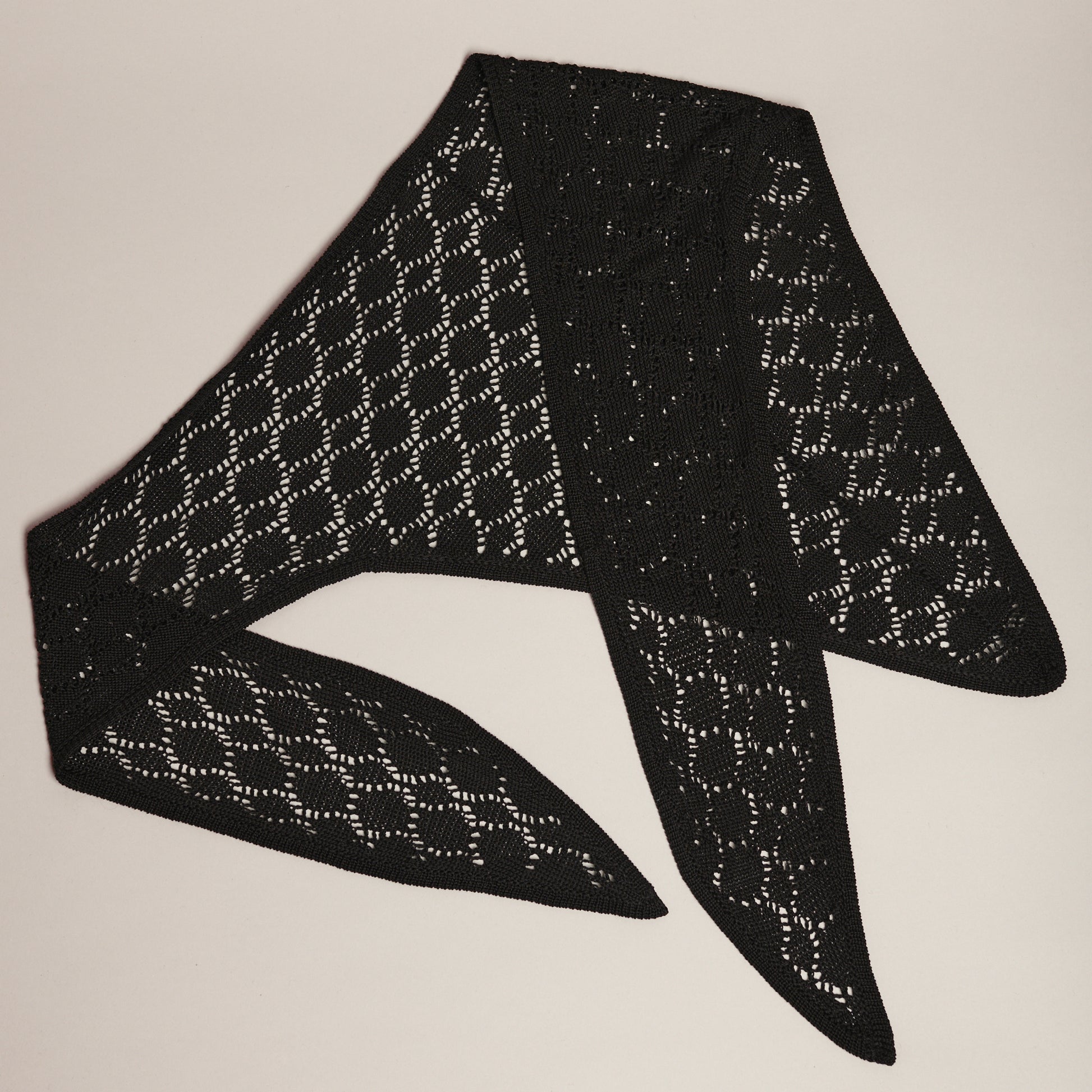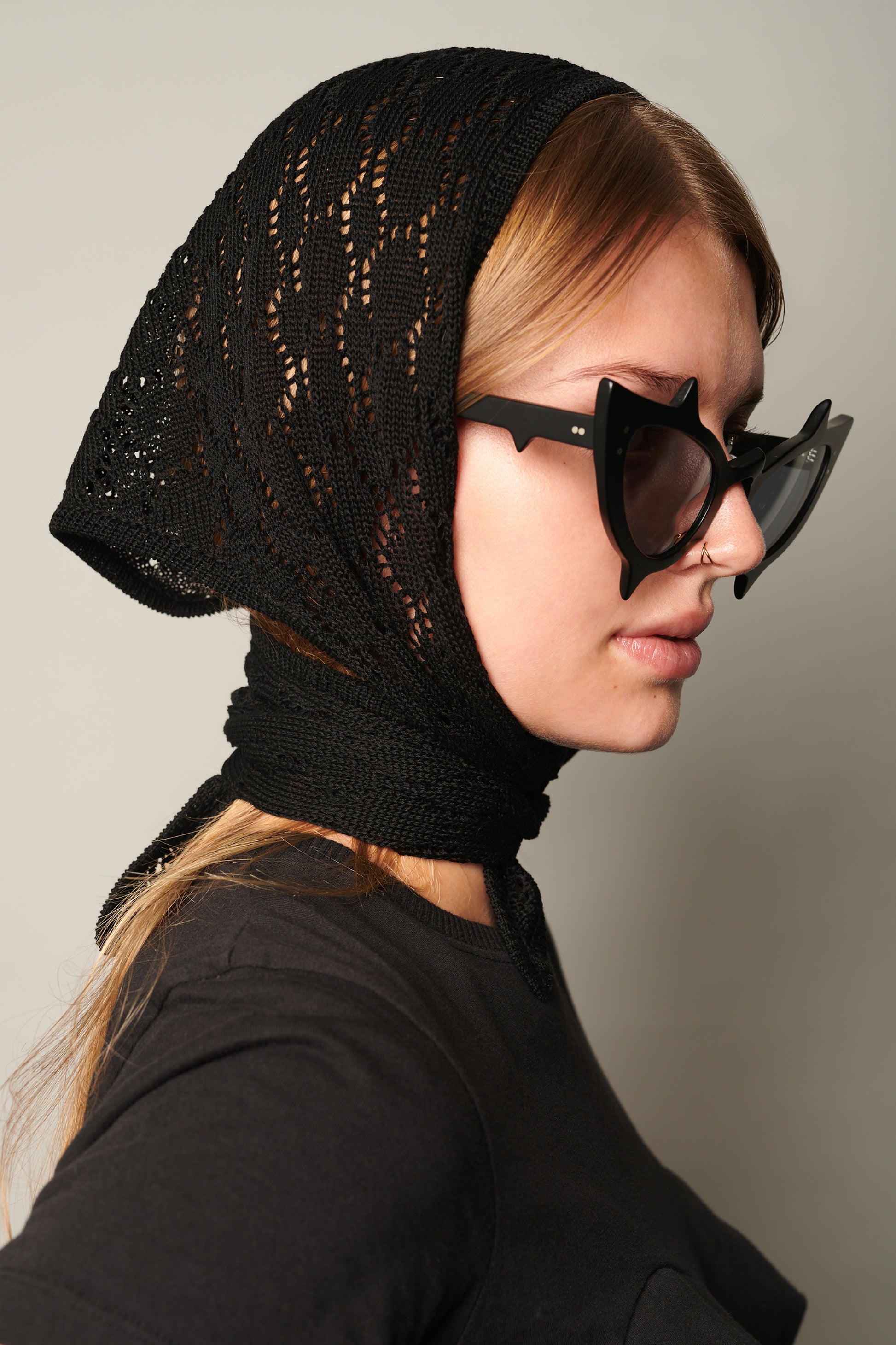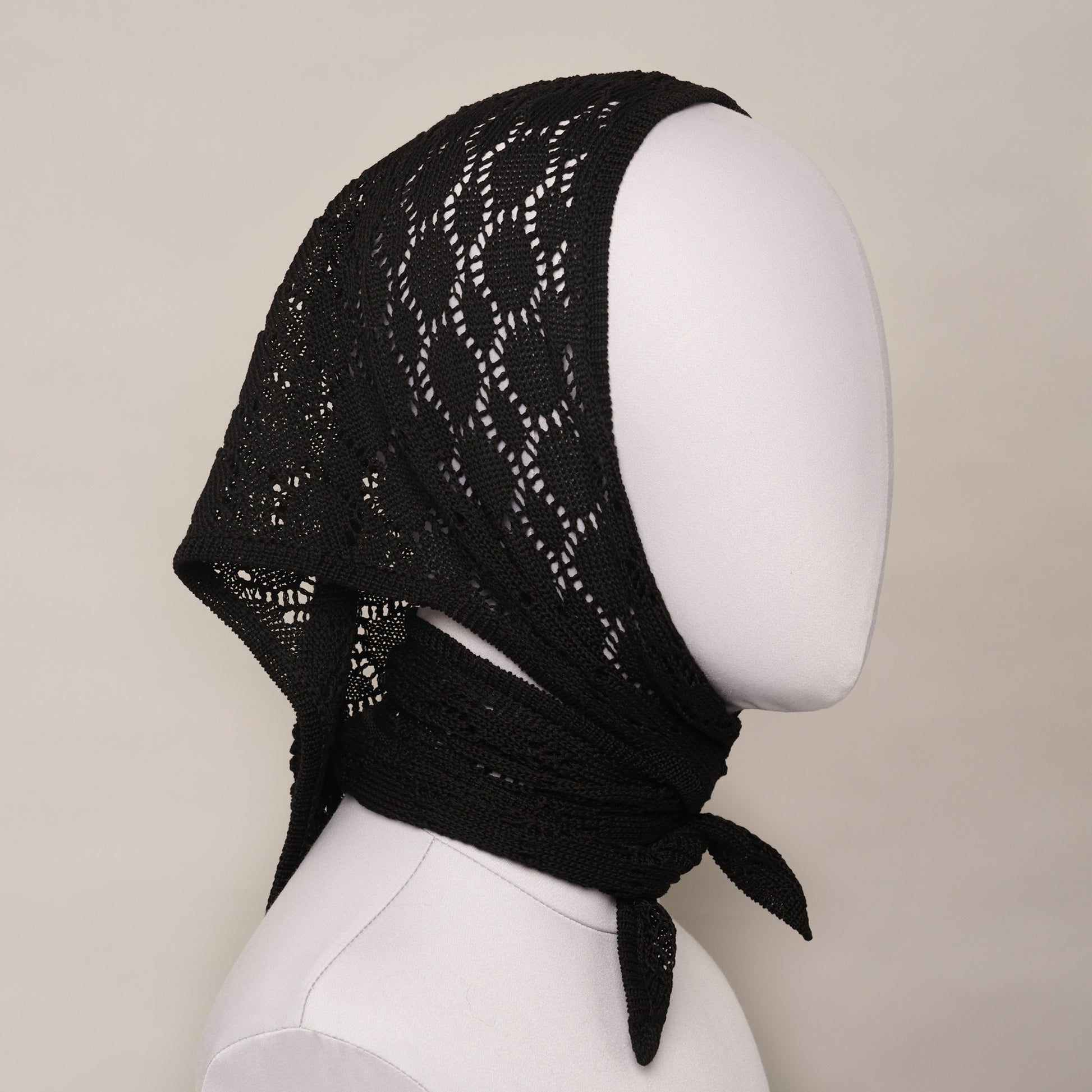Delicate and dreamlike, this cotton lace pointelle knit scarf was created in collaboration with HER.O, an independent artisanal knitwear brand based in London. Fully fashioned and hand-shaped, it is fininshed with a knitted binding. Long, pointed ties allow it to be wrapped or tied at the front or back of the head, offering multiple styling options.