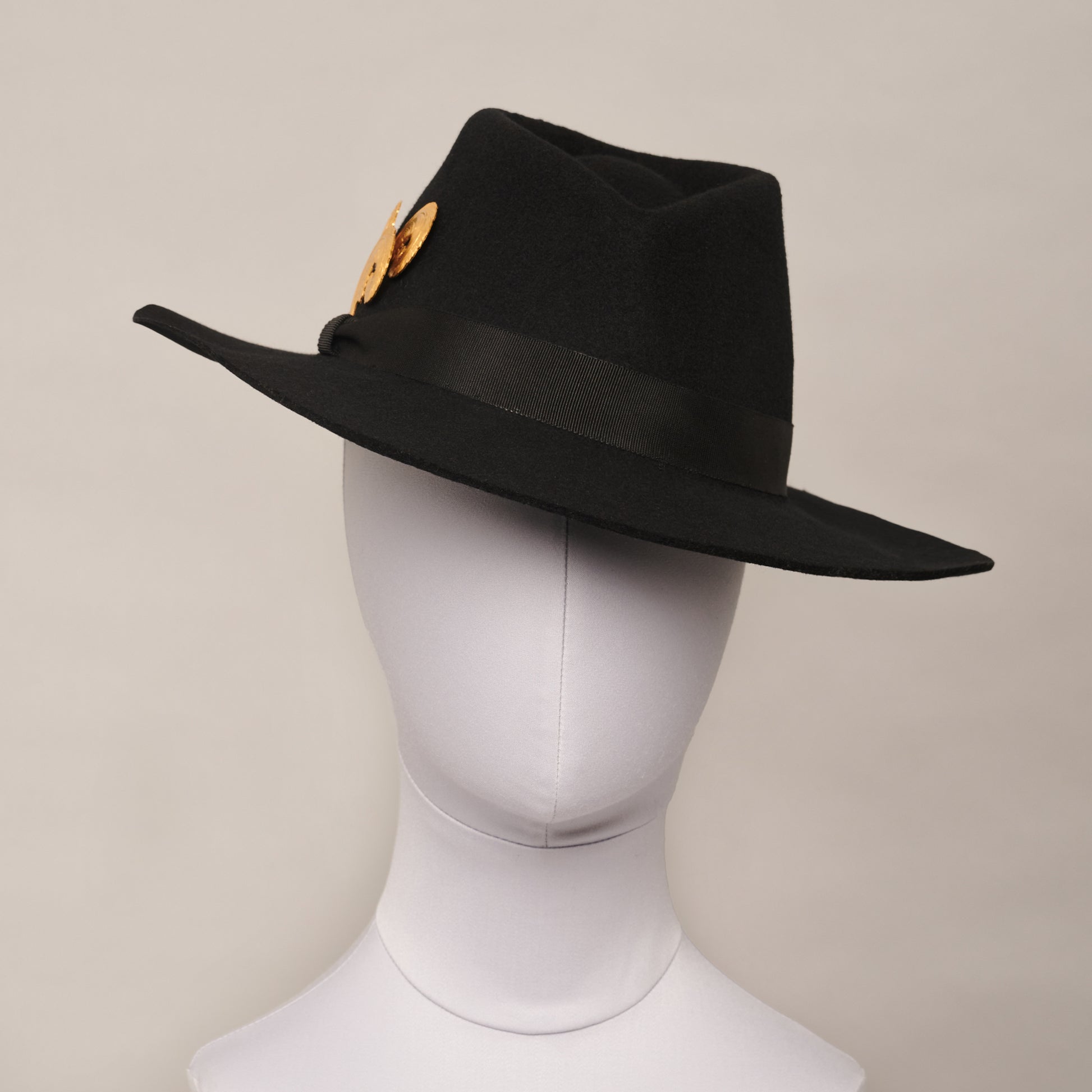 Understated felt fedora, designed to elevate your everyday. Finished with a tonal petersham head ribbon and accented by three dead-stock brass feathers.