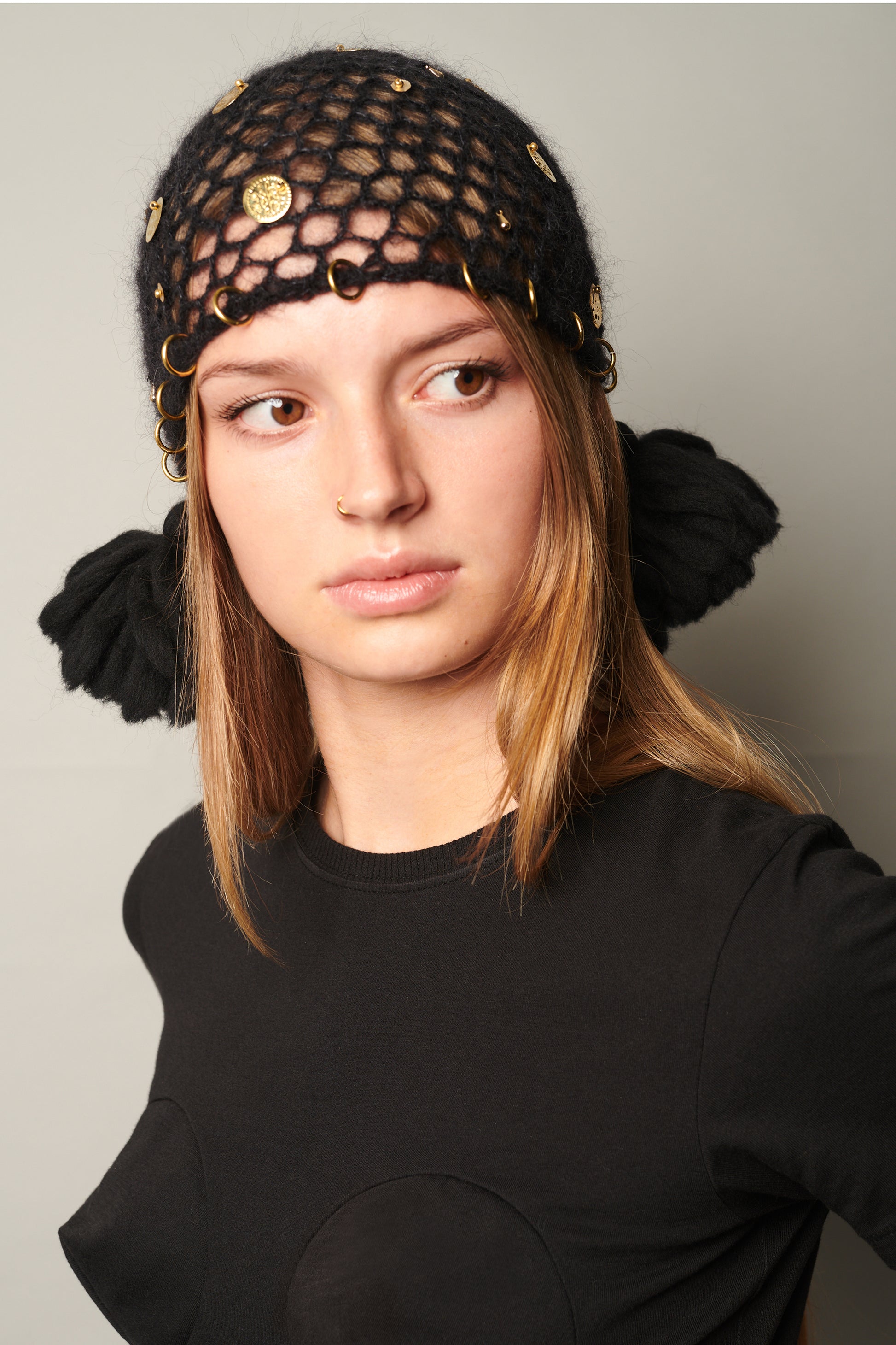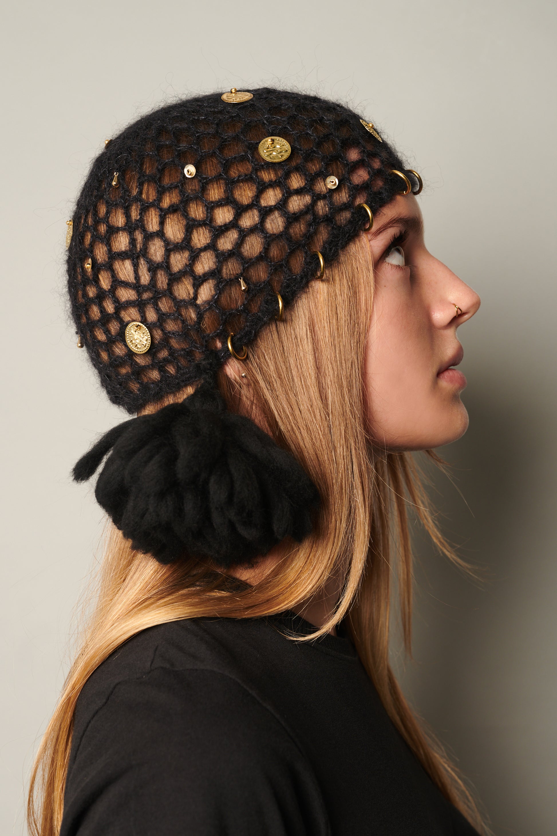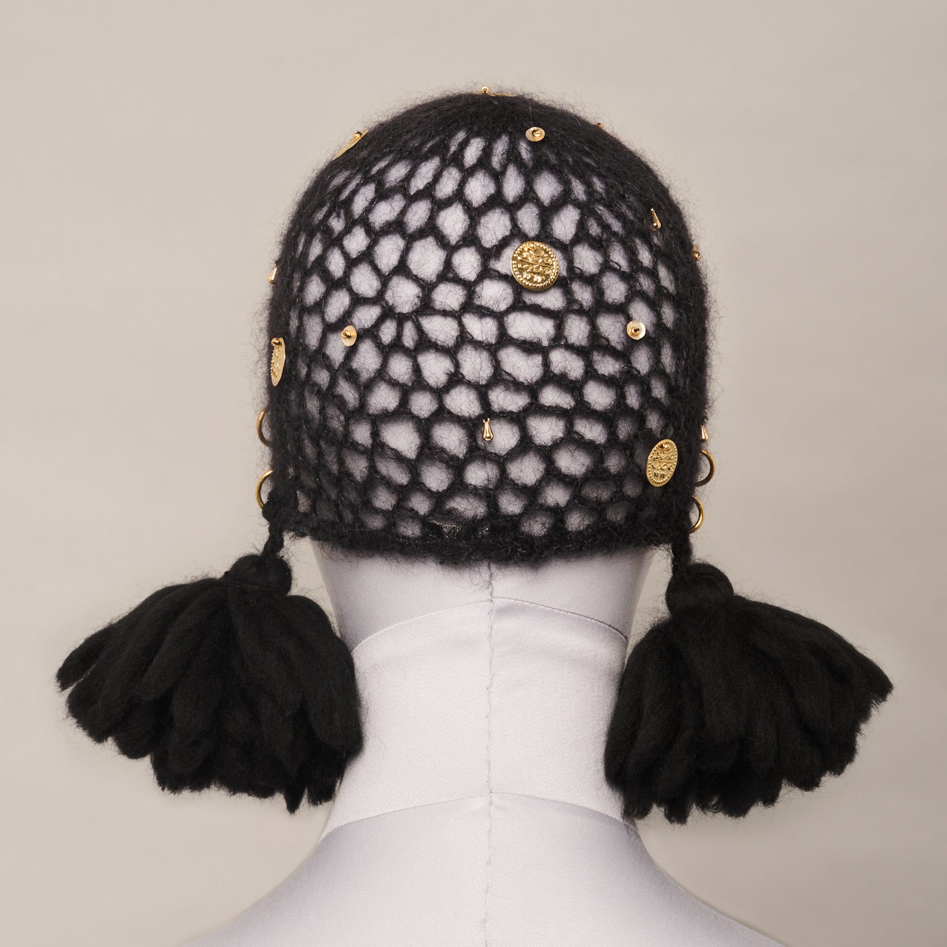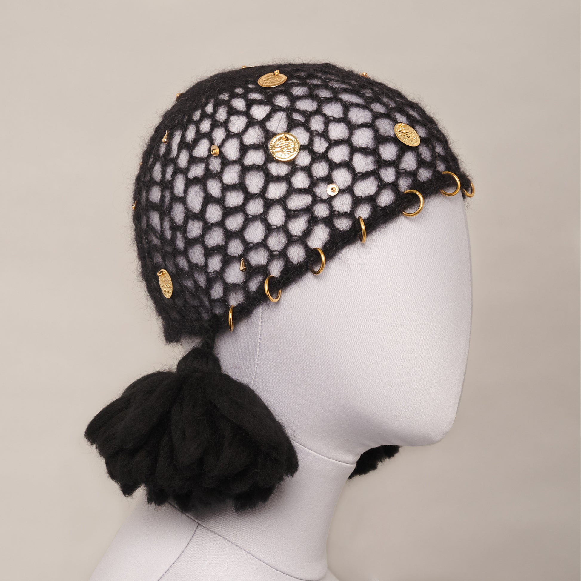This charming juliet cap is hand-crocheted from 100% mohair wool and adorned with a selection of gold-plated embellishments and hand-tied merino wool tassels. Inspired by the Ferronnière – a jewelled headpiece traditionally worn with hairnets in the 1500s.