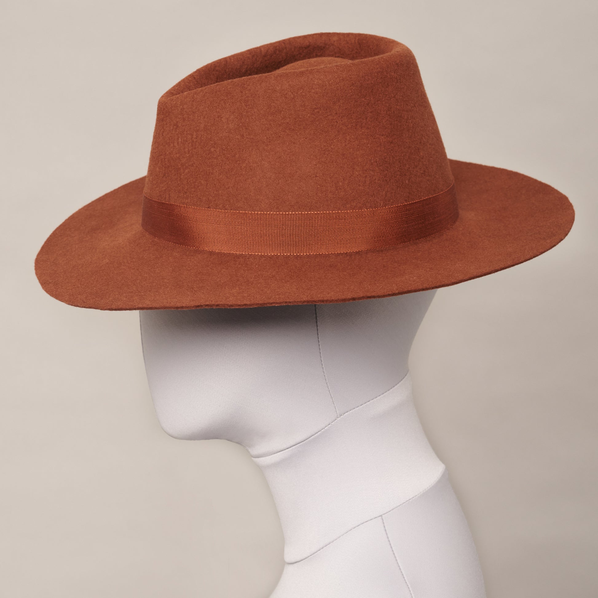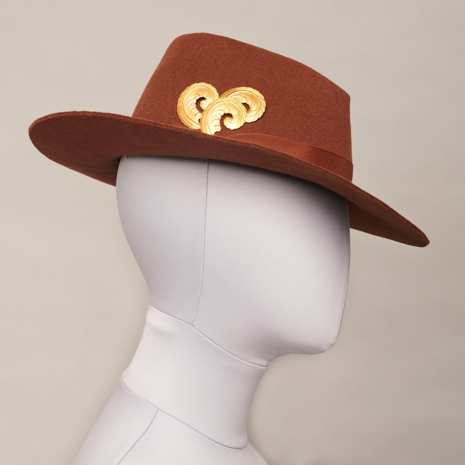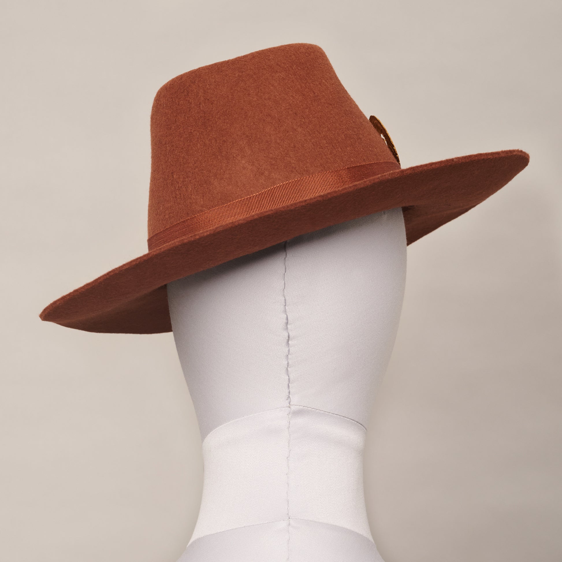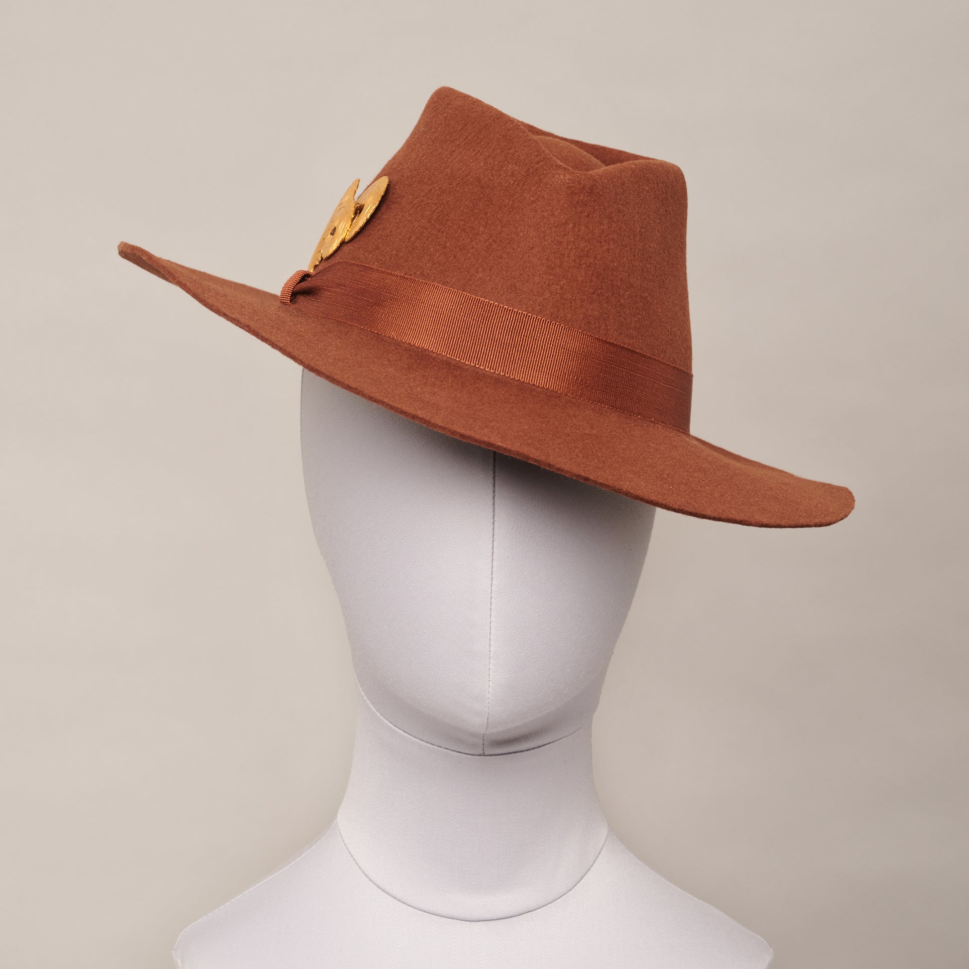 Understated felt fedora, designed to elevate your everyday. Finished with a tonal petersham head ribbon and accented by three dead-stock brass feathers.