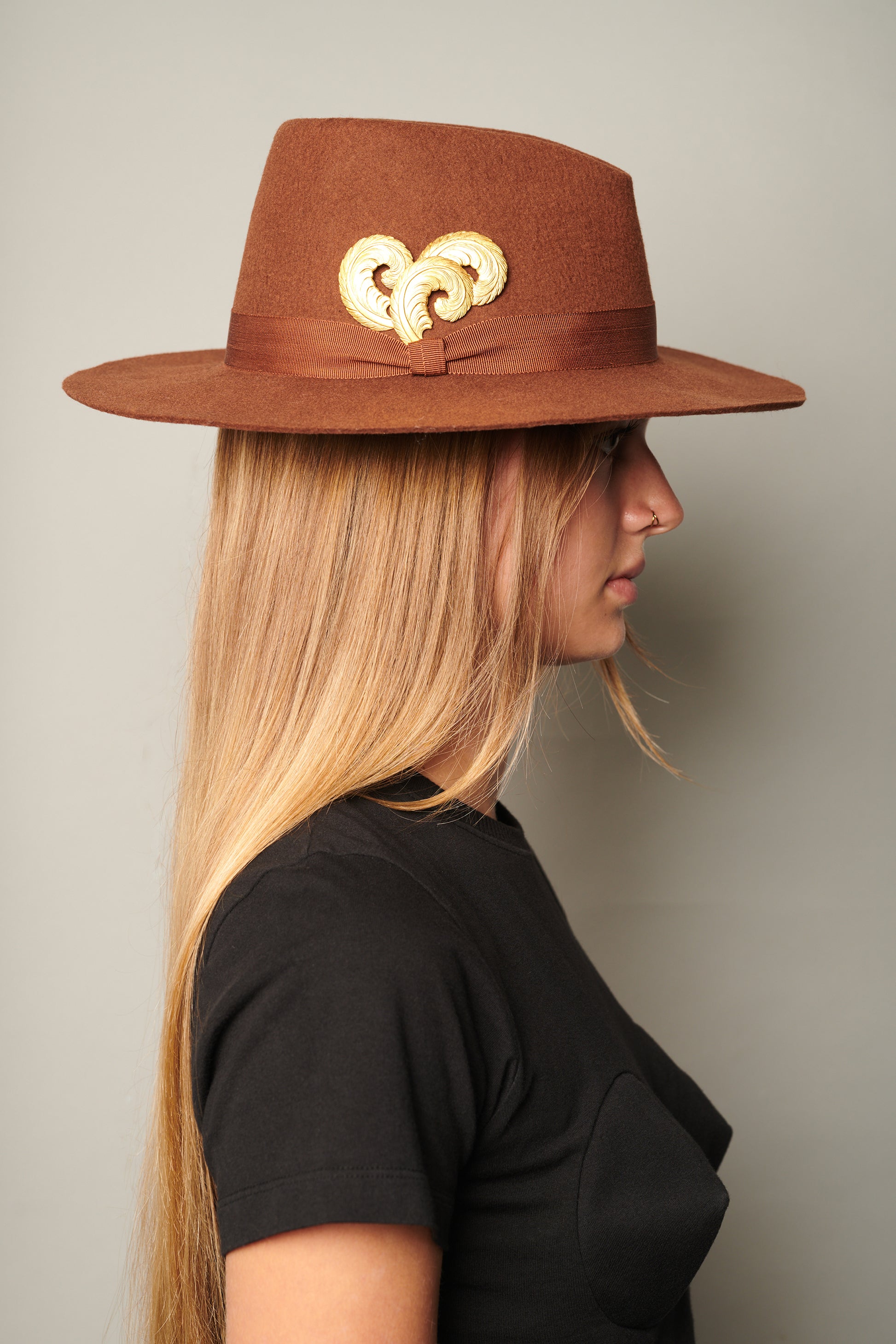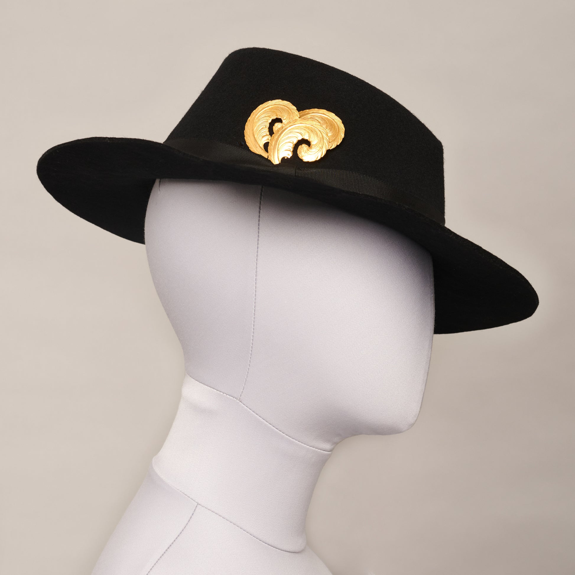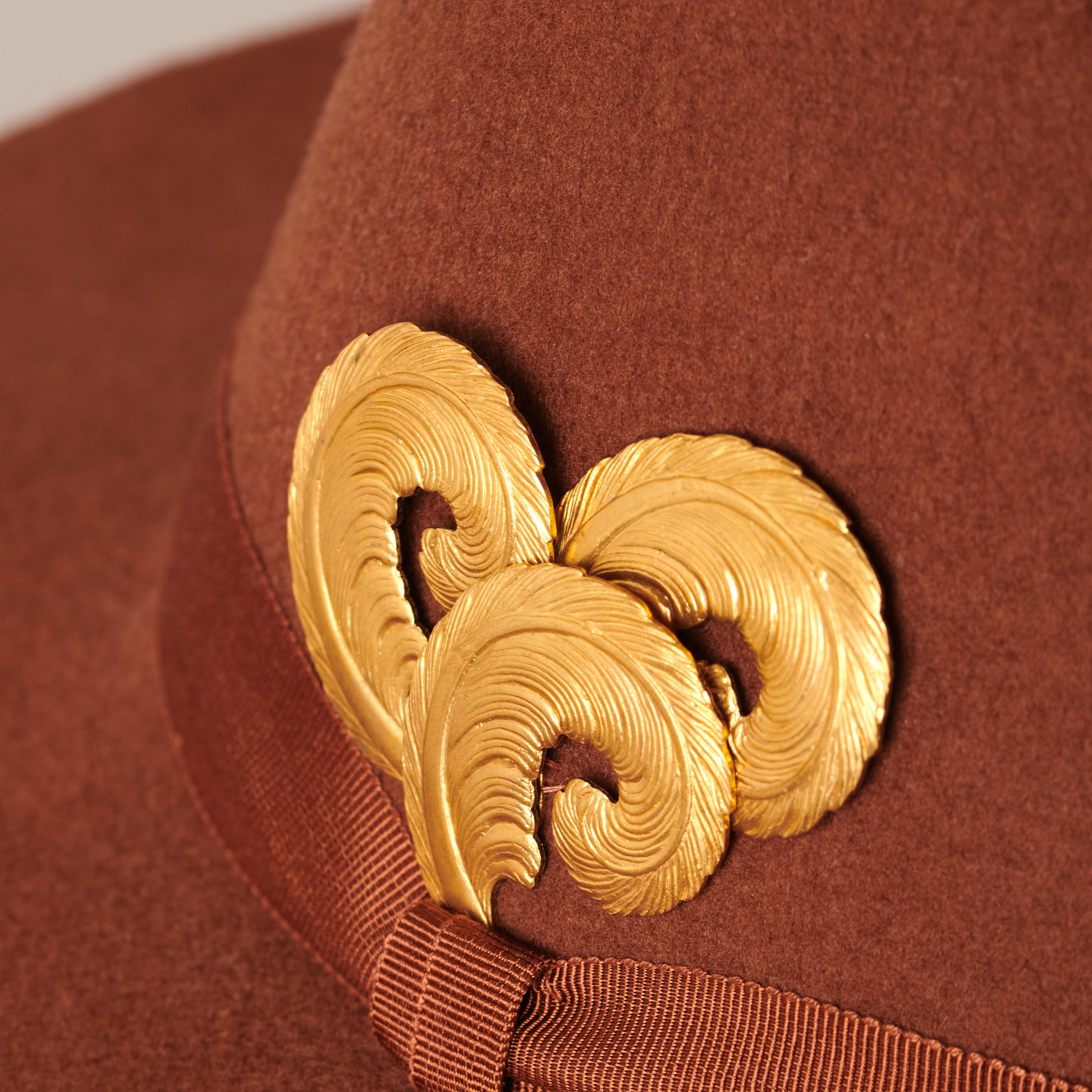 Understated felt fedora, designed to elevate your everyday. Finished with a tonal petersham head ribbon and accented by three dead-stock brass feathers.