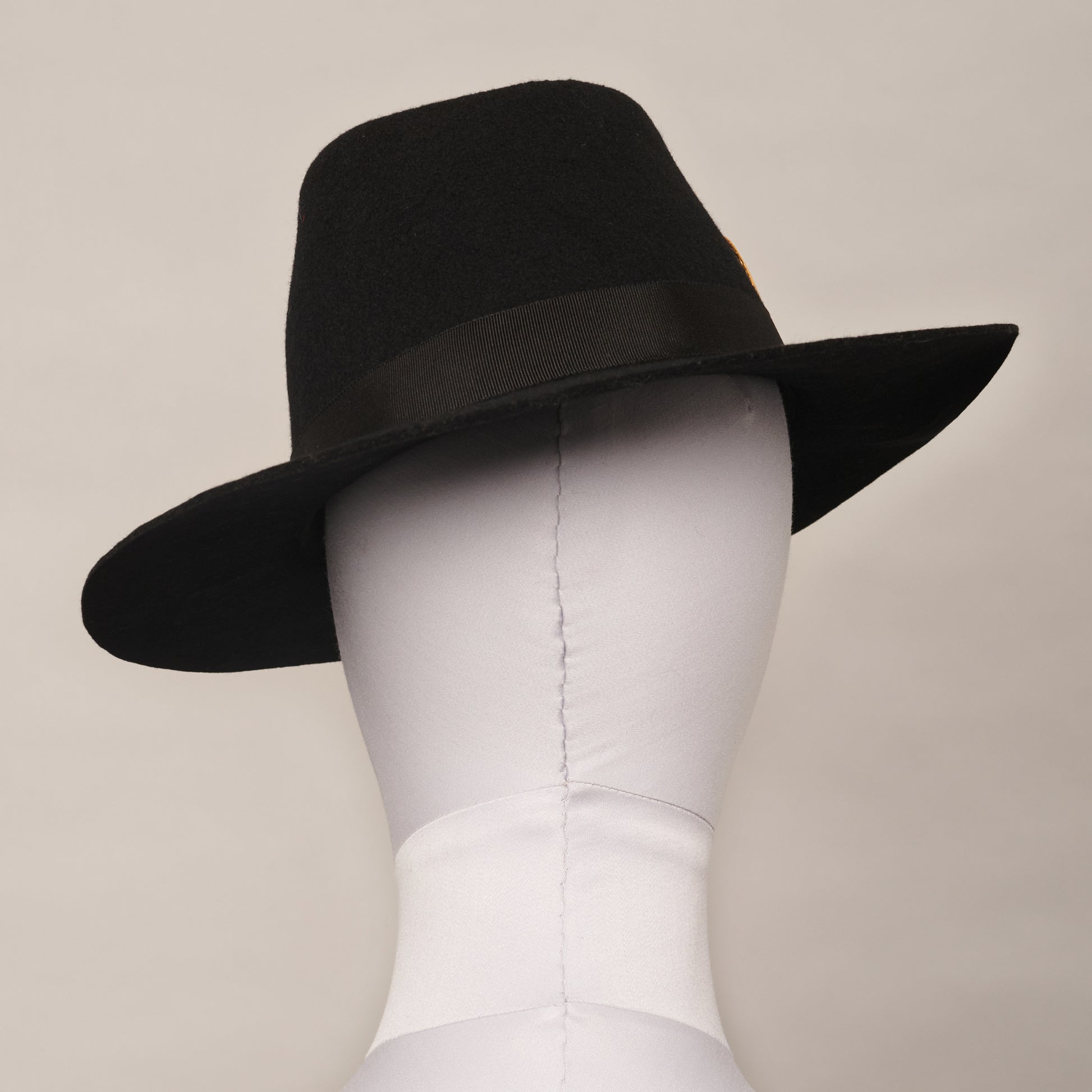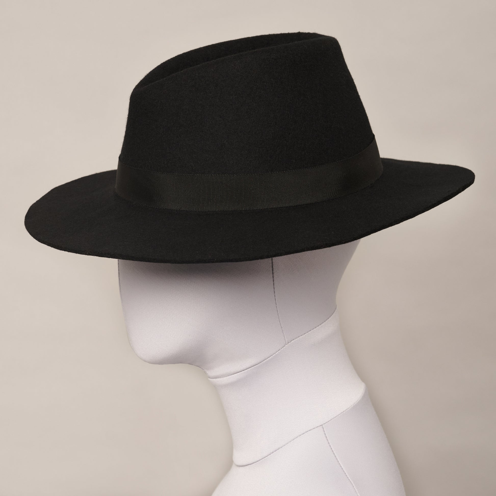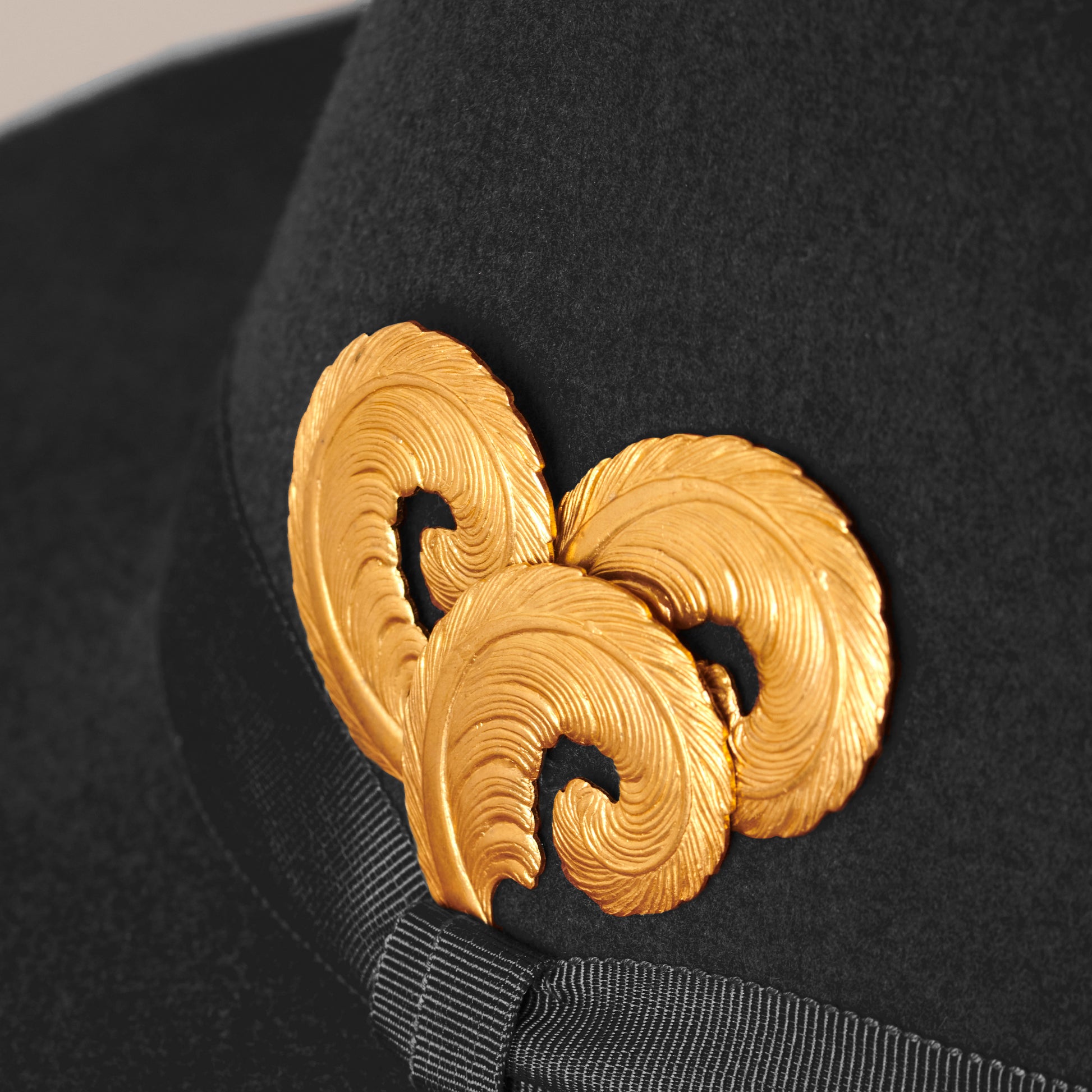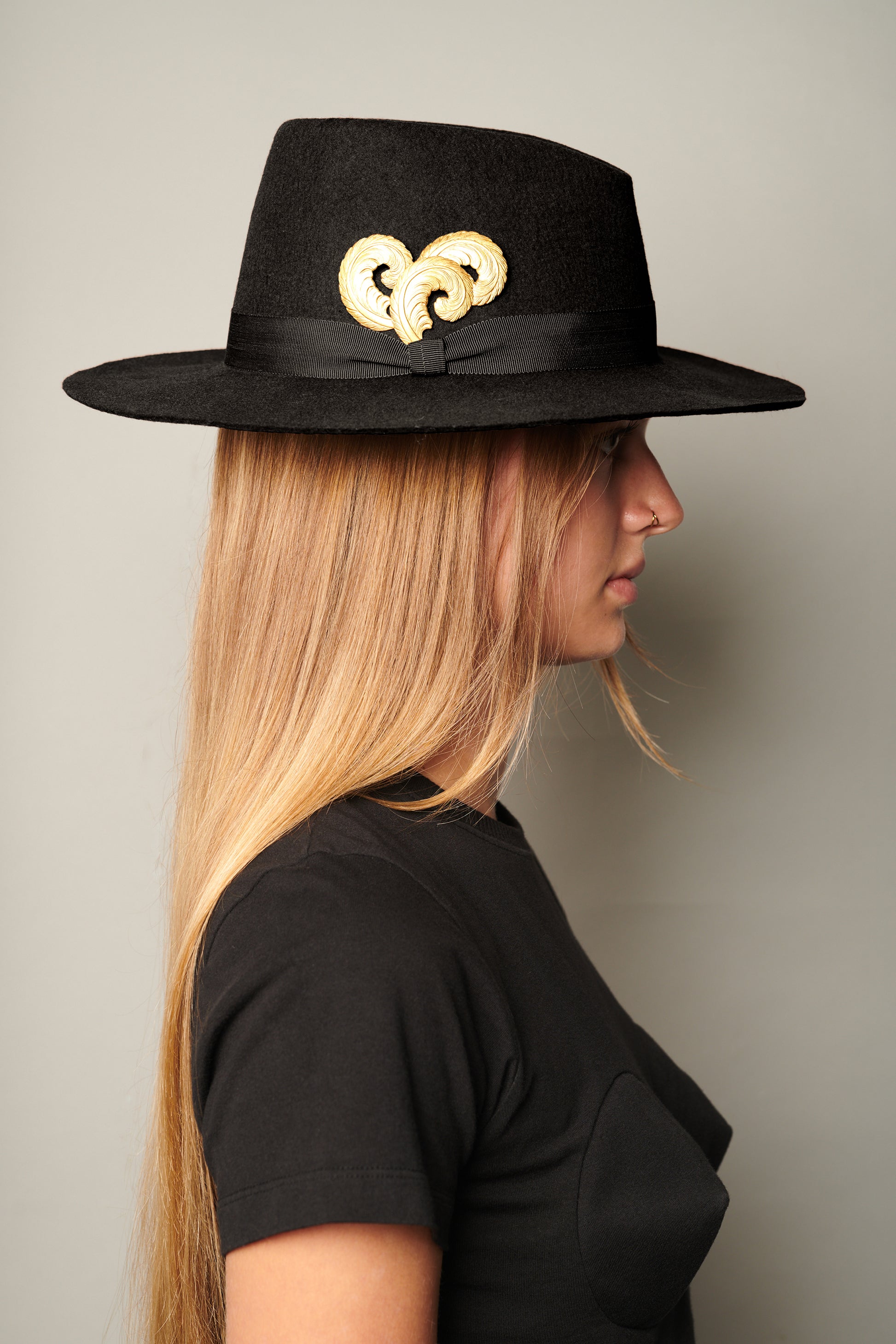Understated felt fedora, designed to elevate your everyday. Finished with a tonal petersham head ribbon and accented by three dead-stock brass feathers.