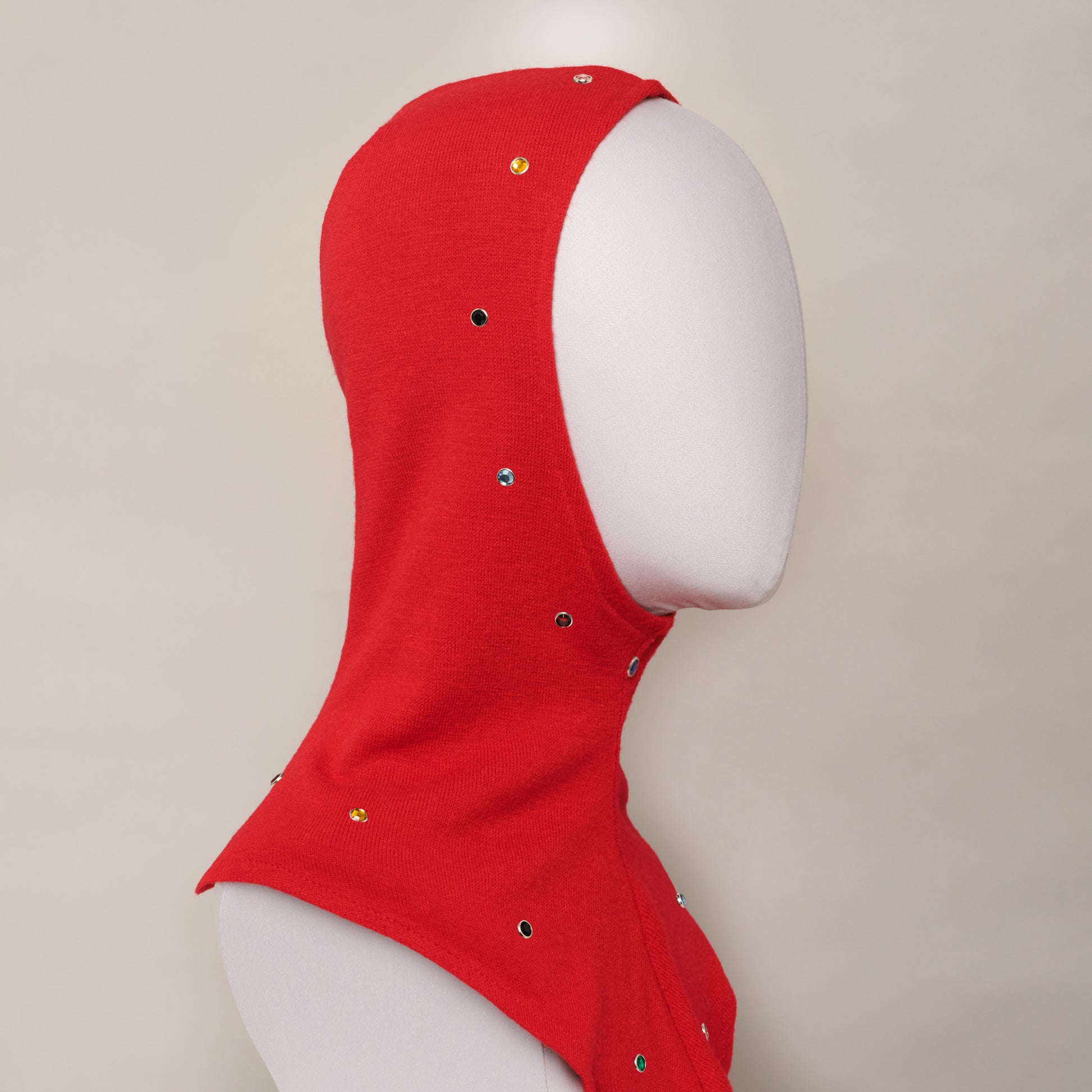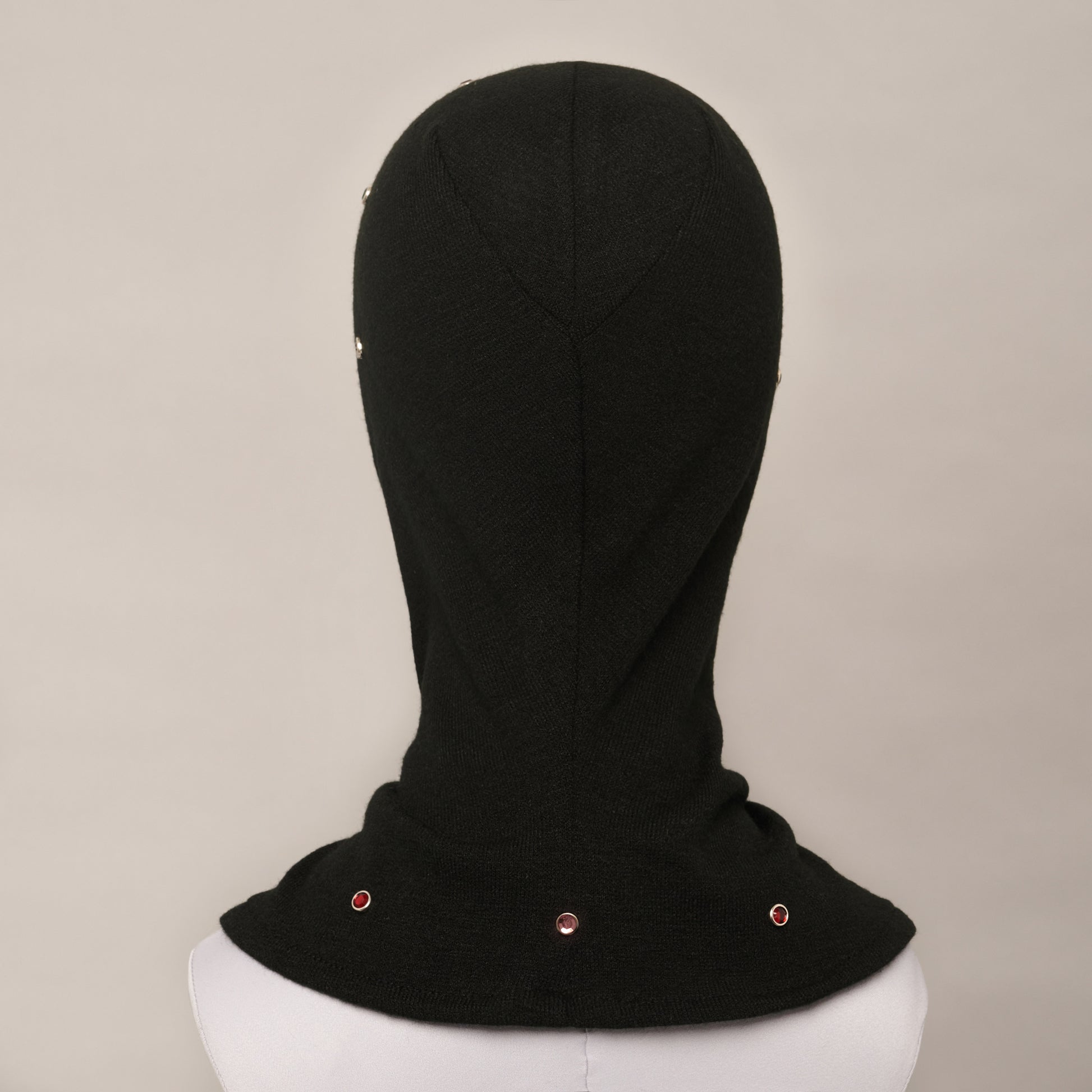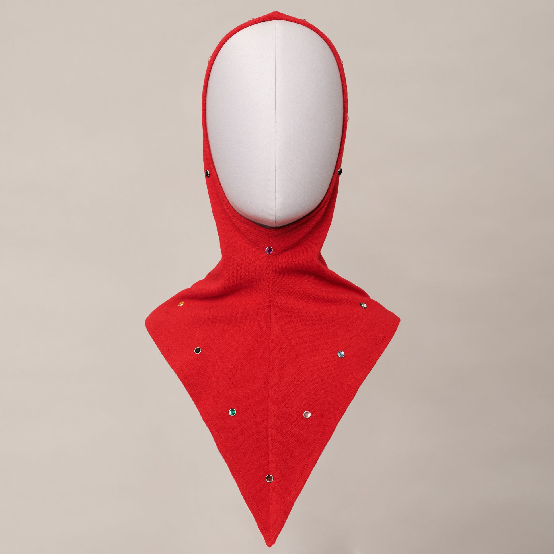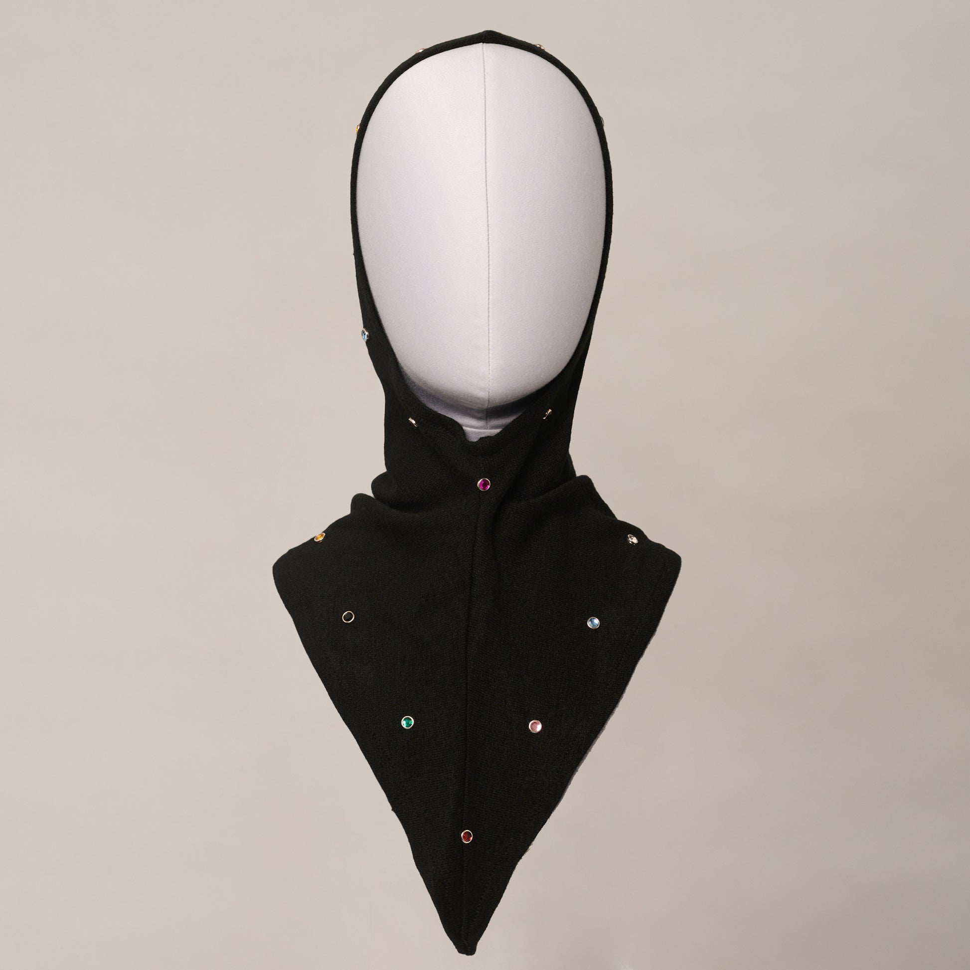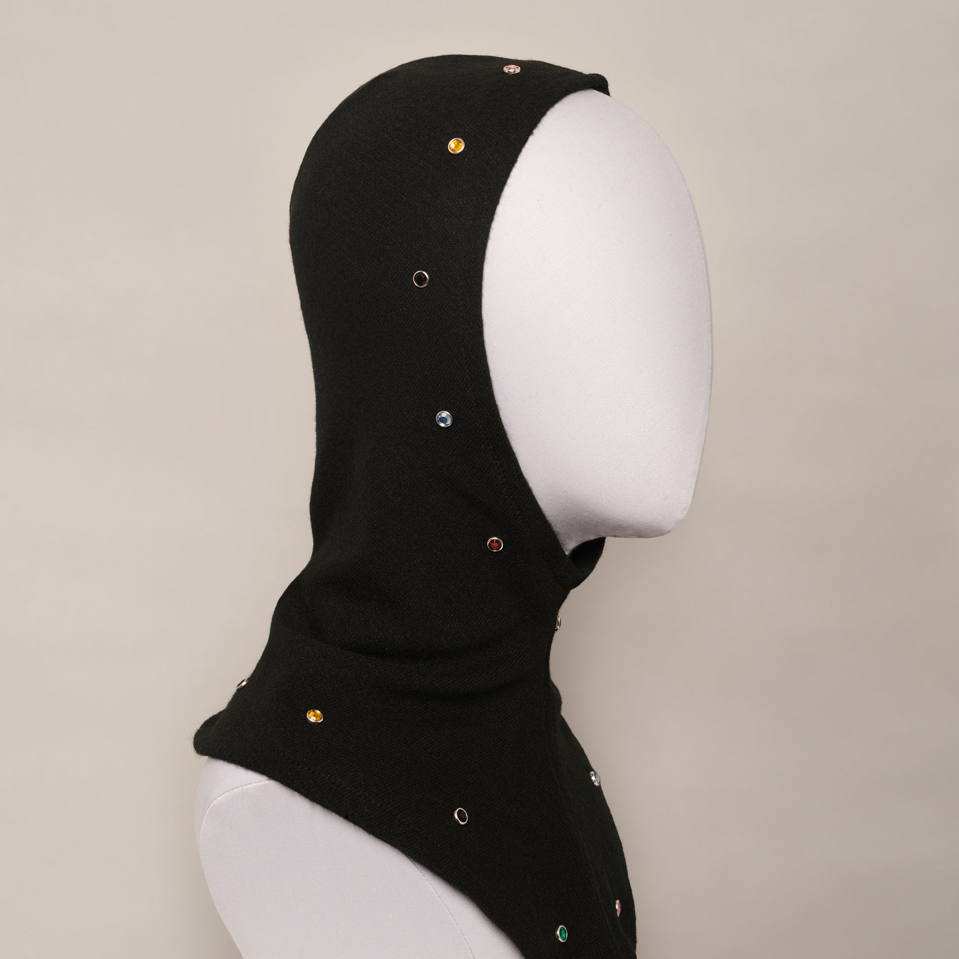 Luxuriously soft, wool-mix hood that reimagines a medieval silhouette, complete with a pointed neckline adorned with multi-coloured jewels. An effortless winter warmer that works perfectly on its own or as a layering piece under other hats for extra warmth and texture.