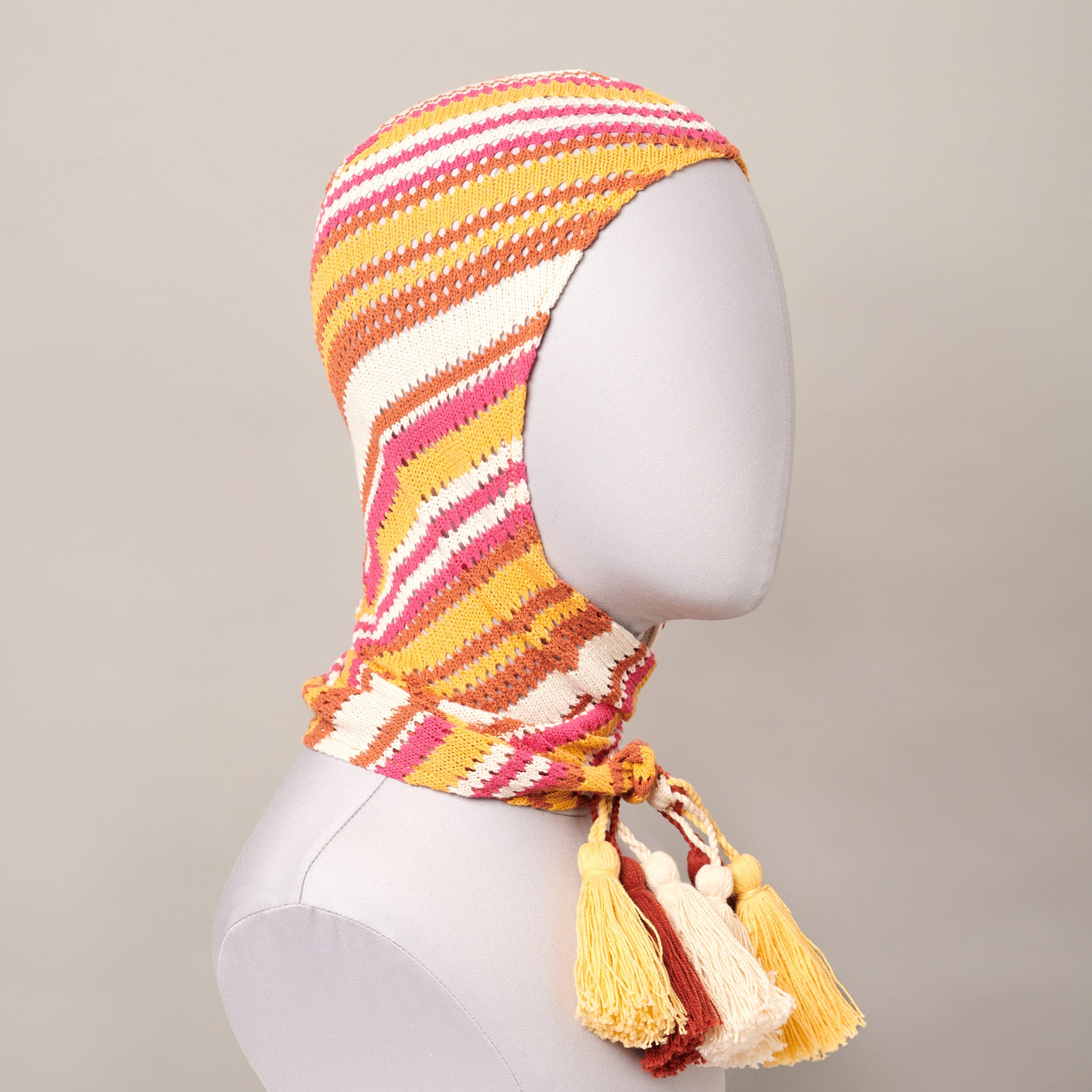 Cotton crotchet hood with long ties and a a trio of cotton tassels. Can be worn long or tied to suit your style. Pairs perfectly with other hats.