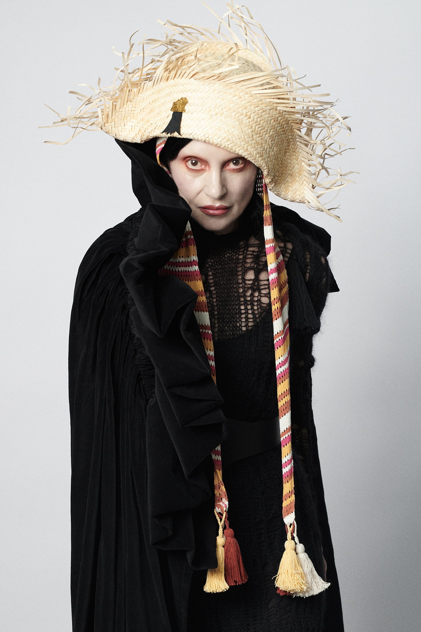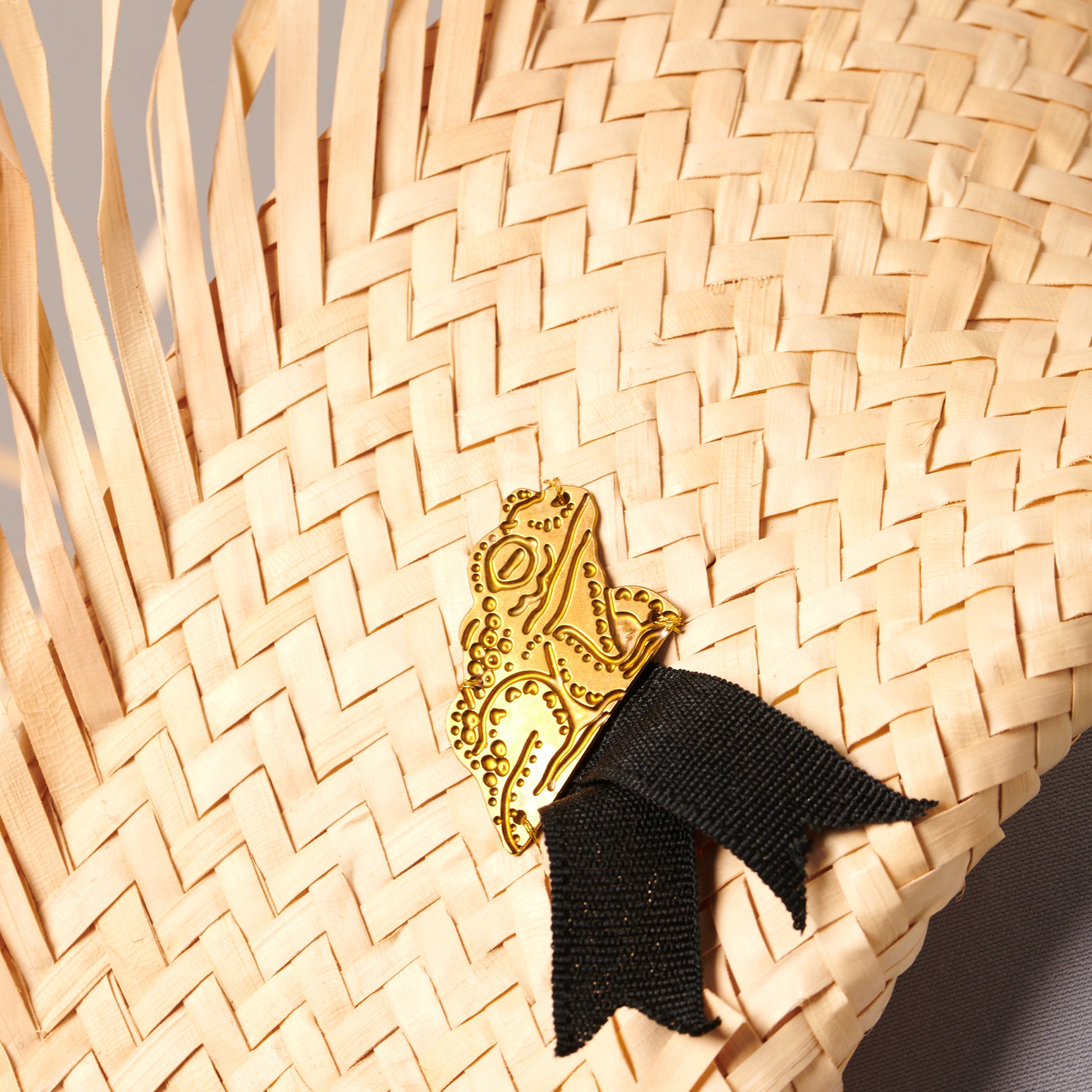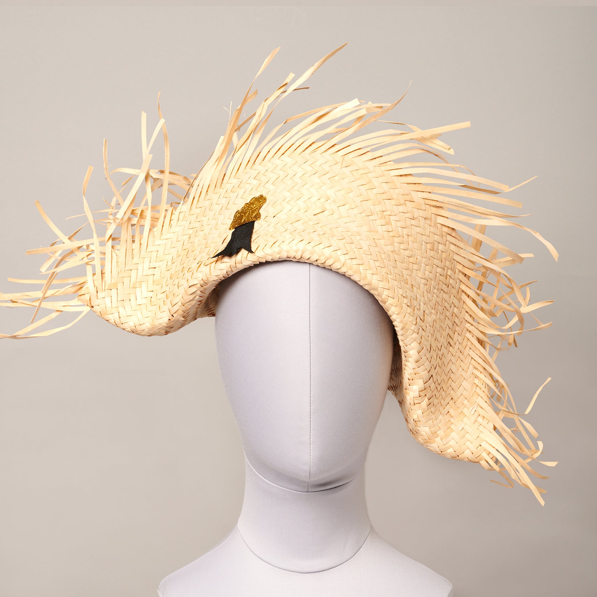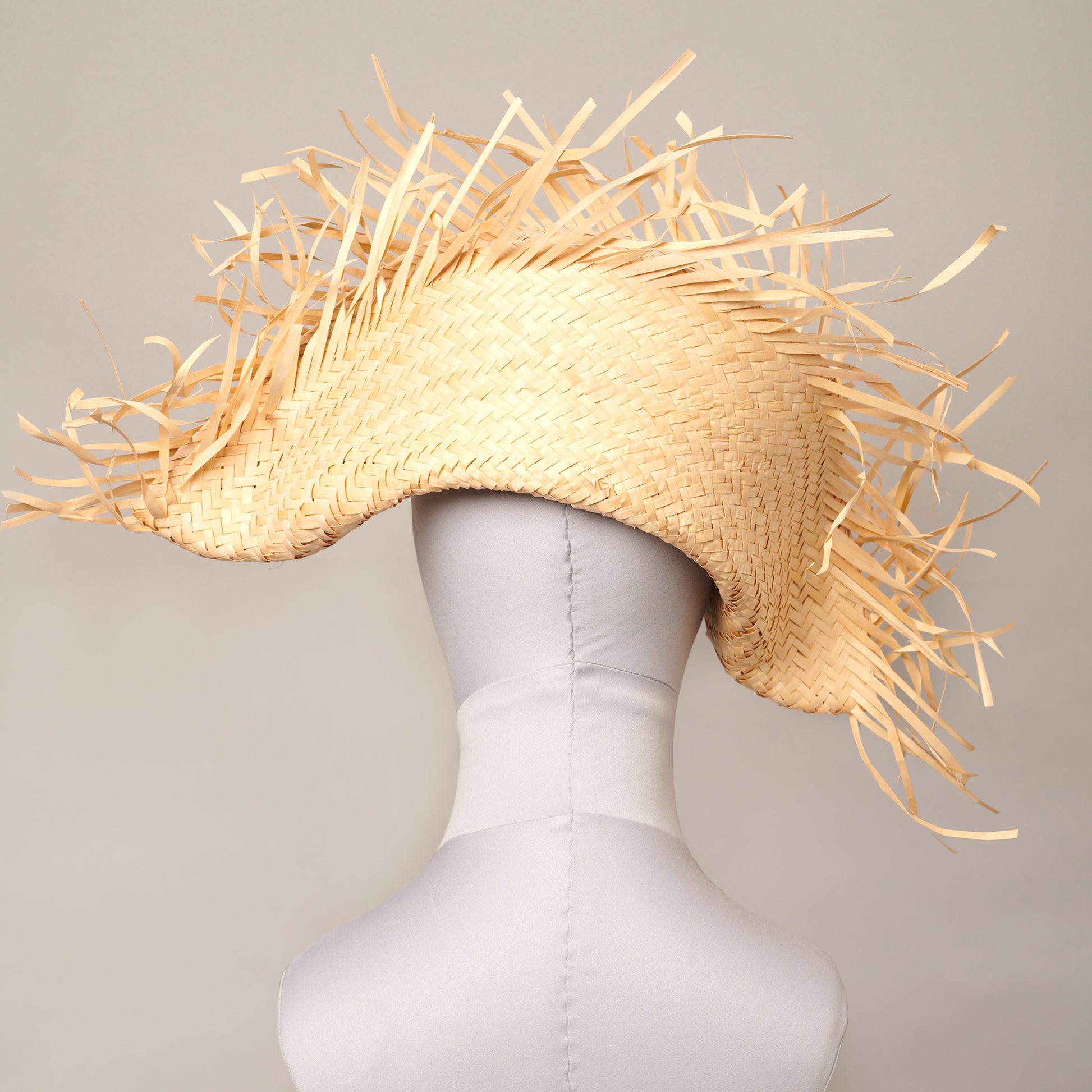 Effortlessly striking, our bicorne is hand-blocked from woven palm straw. The natural straw has a dynamic frayed edge and is finished with a brass frog and ribbon detail.