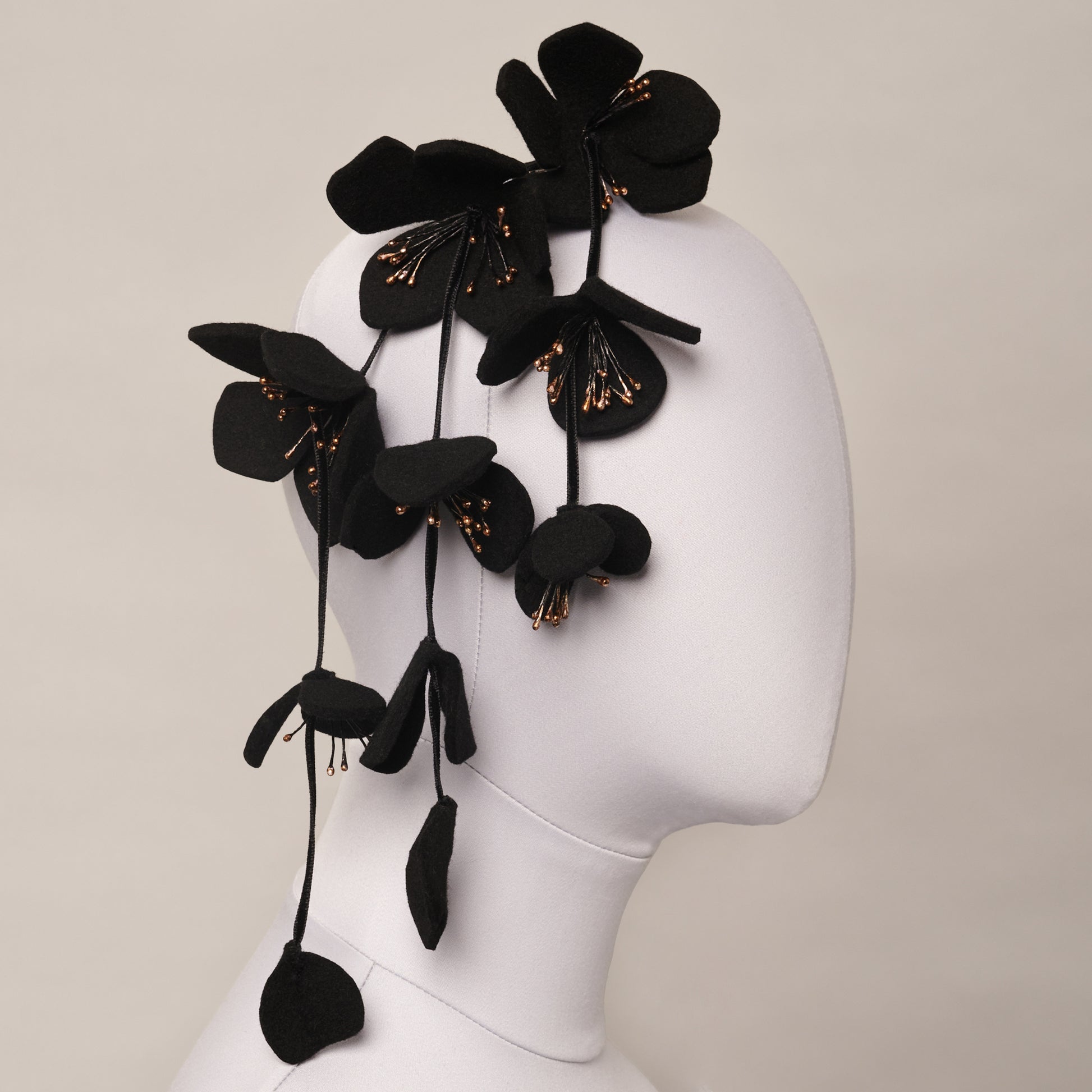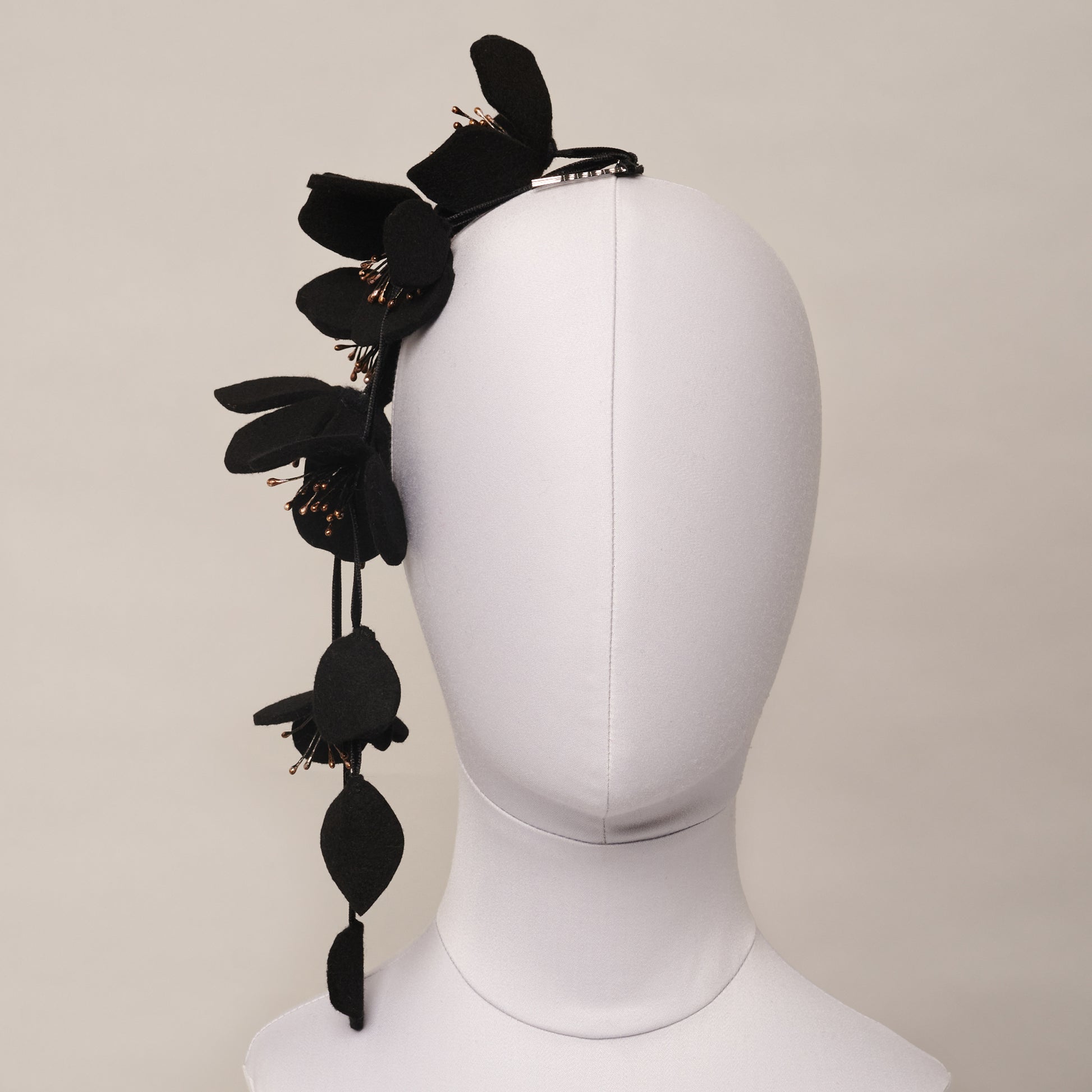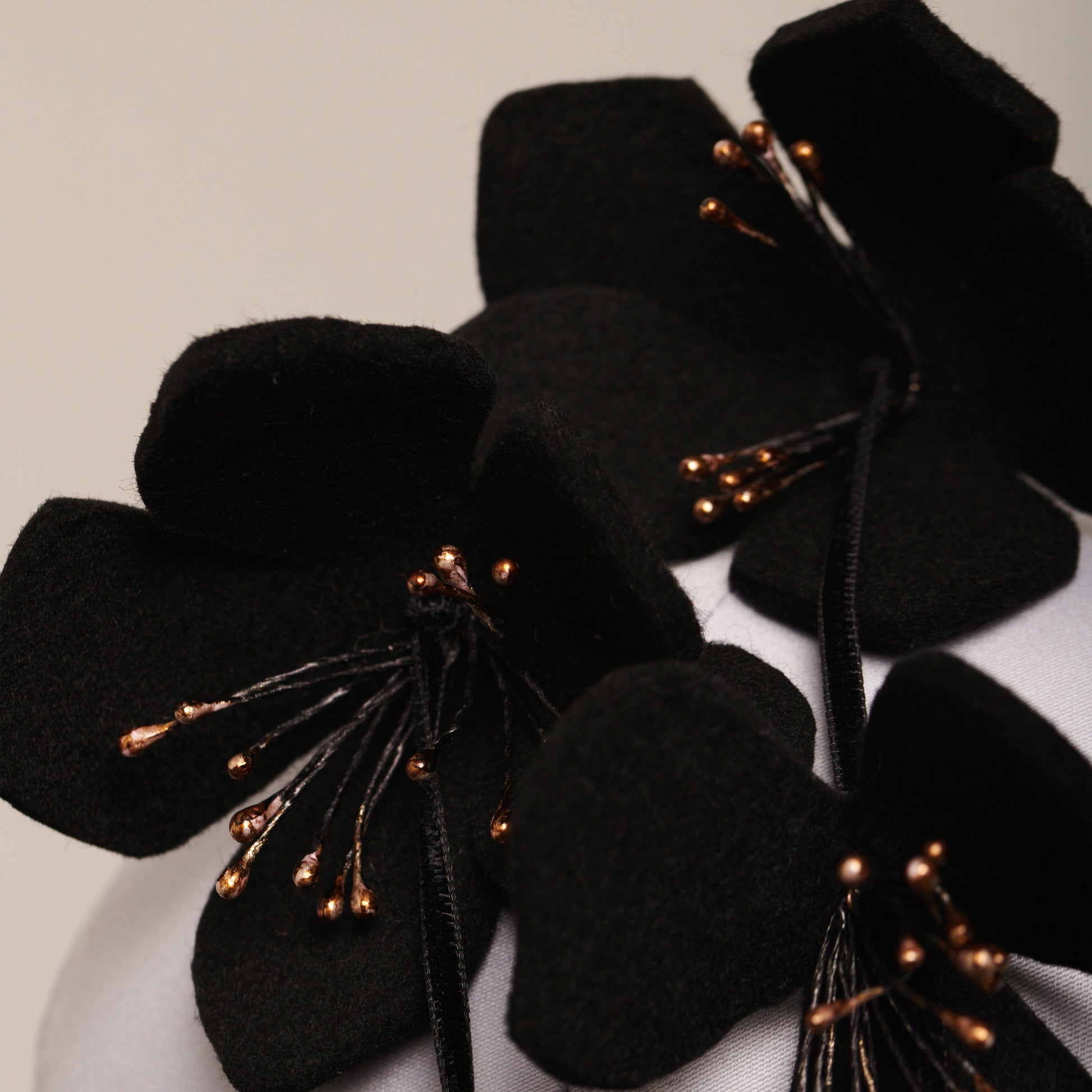 Wool felt flowers, deadstock stamens, black ribbon, metal comb.