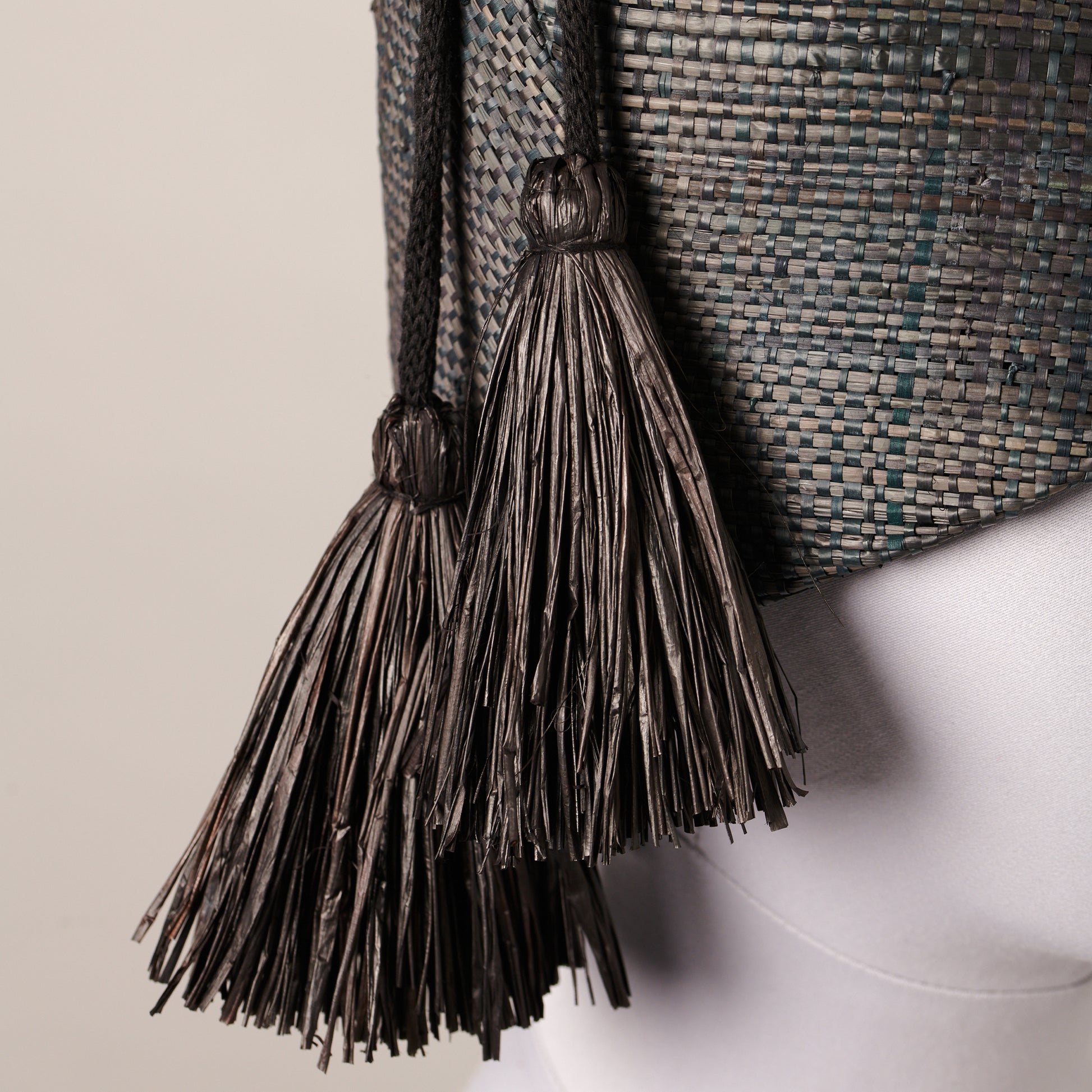 100% woven straw, straw tassels. Petersham head-fitting.