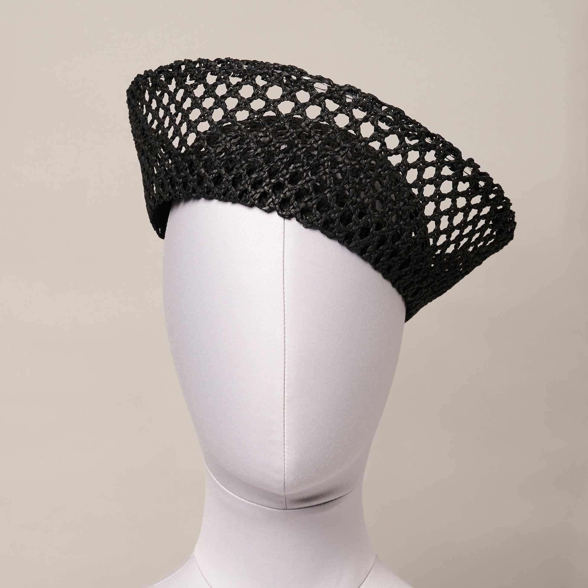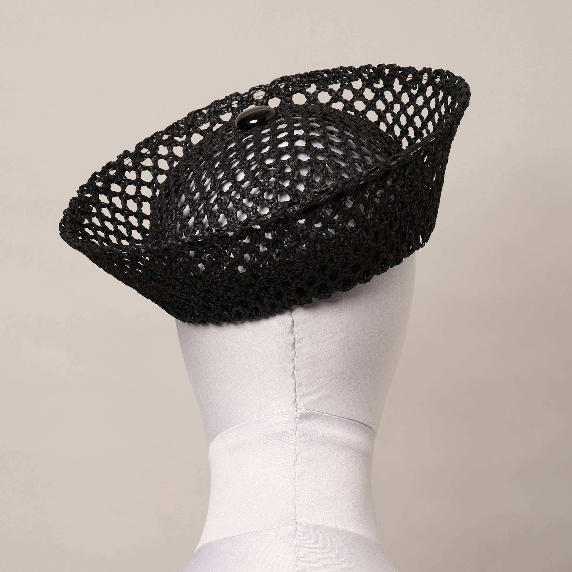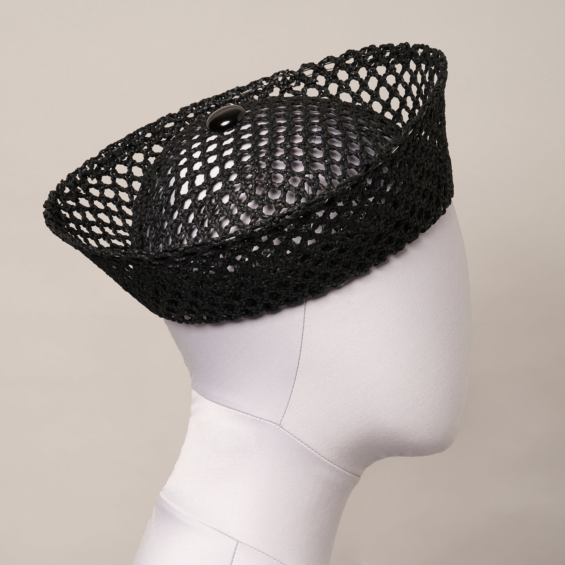 A modern take on a classic, this black fishnet straw sailor hat is hand-blocked in our studio. Finished with a painted brass button detail.