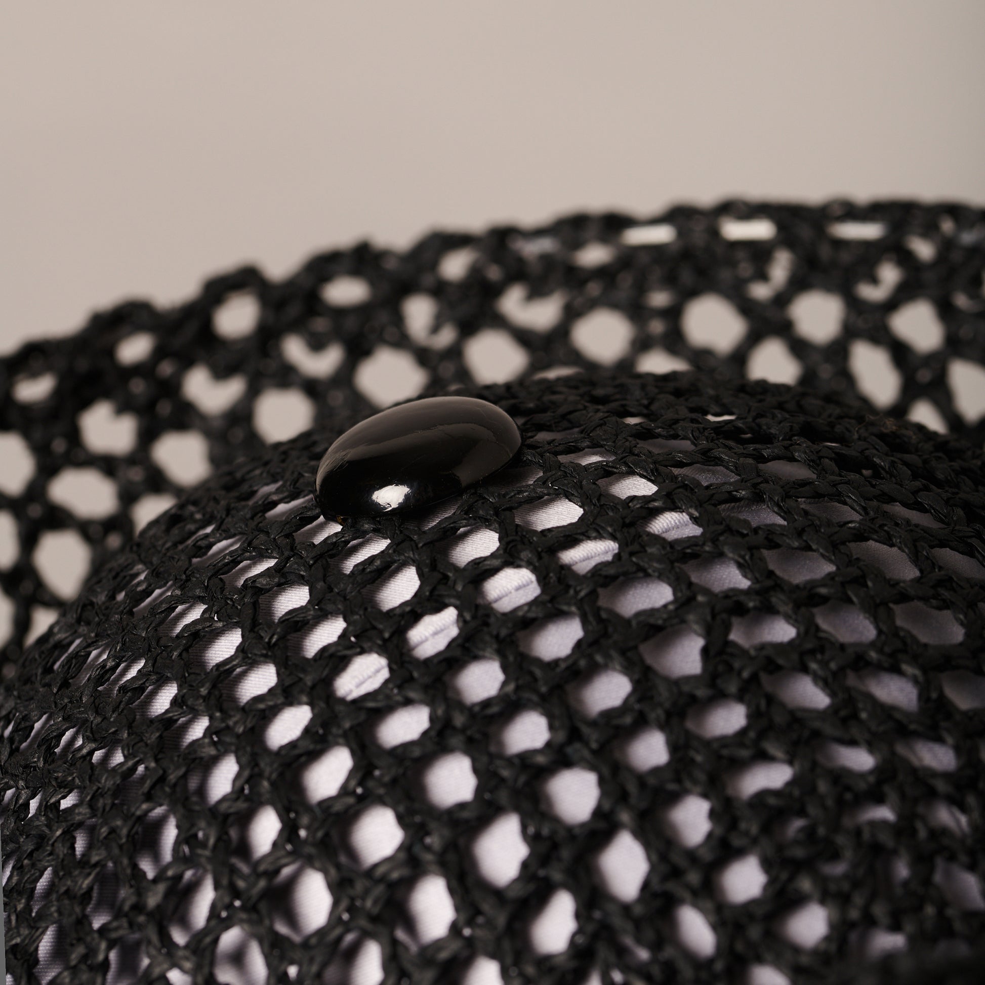 Woven fishnet straw. Petersham cotton ribbon. Painted brass button.