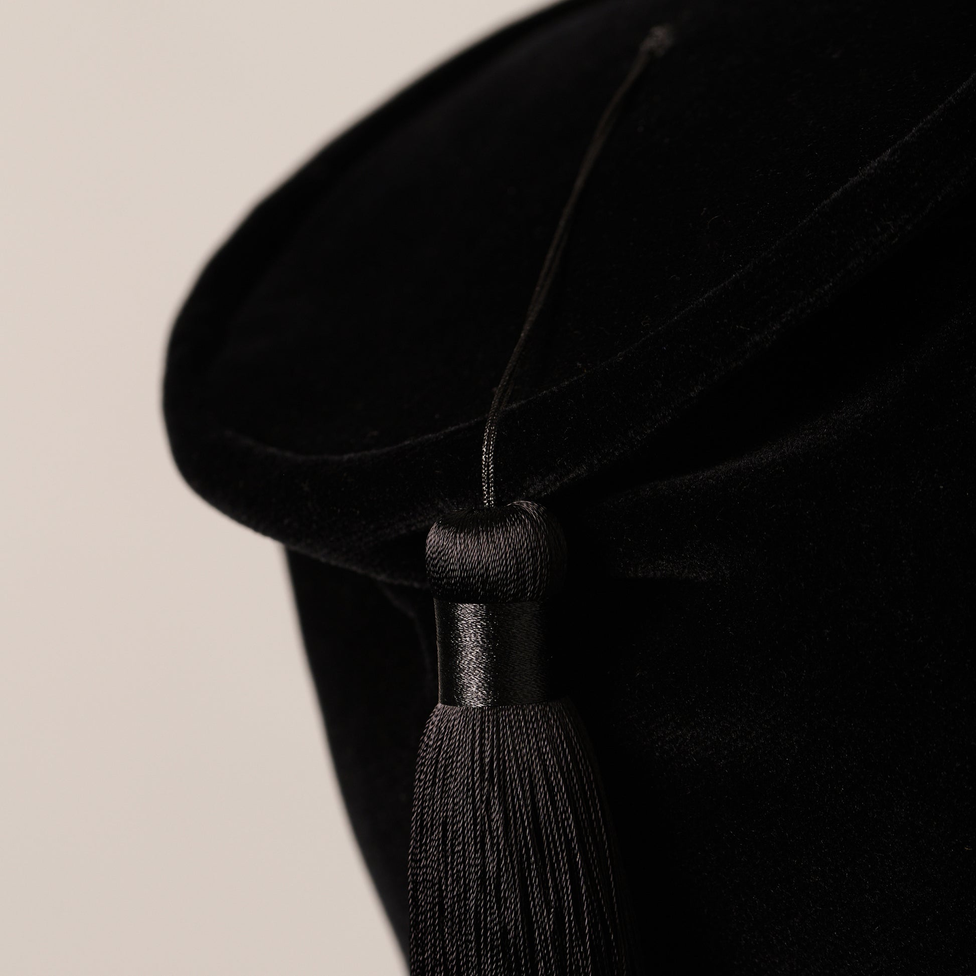 100% velvet, 100% rayon tassel. Petersham head-fitting.