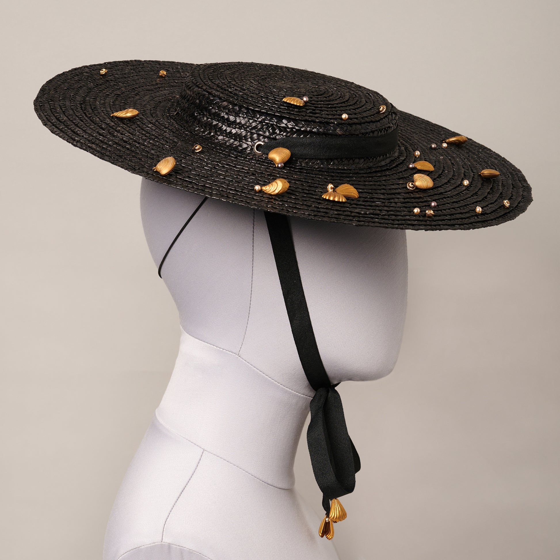 A stitched straw* perching boater with a wide, flat brim. The design is adorned with a selection of pearls, beads and vintage brass shells. The ribbon can be styled under the chin or at the back of the neck. Secured with an elastic and soft padded head-fitting.