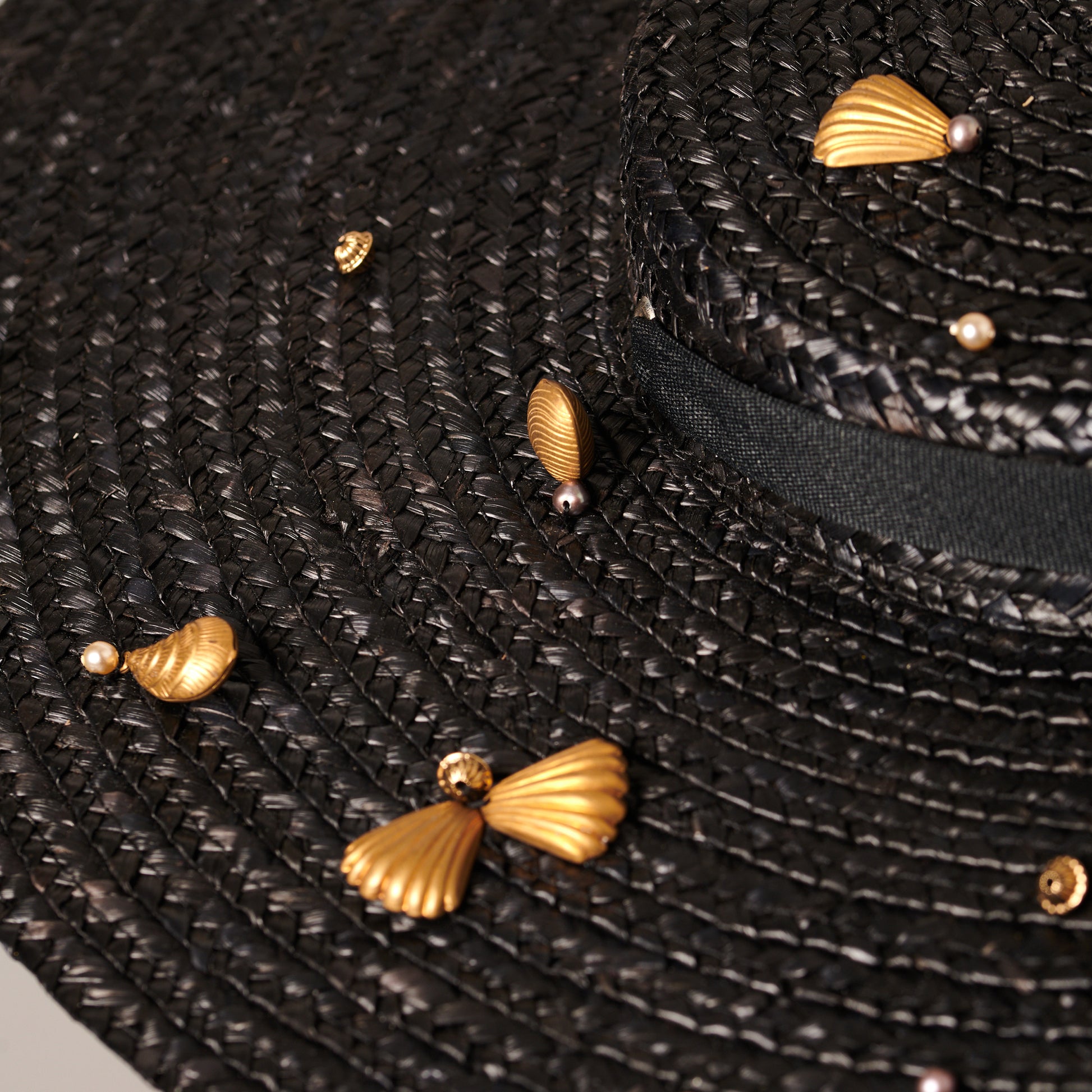 Stitched straw hat, padded cotton head-fitting, grosgrain ribbon. Pearls, metal beads, brass shells.